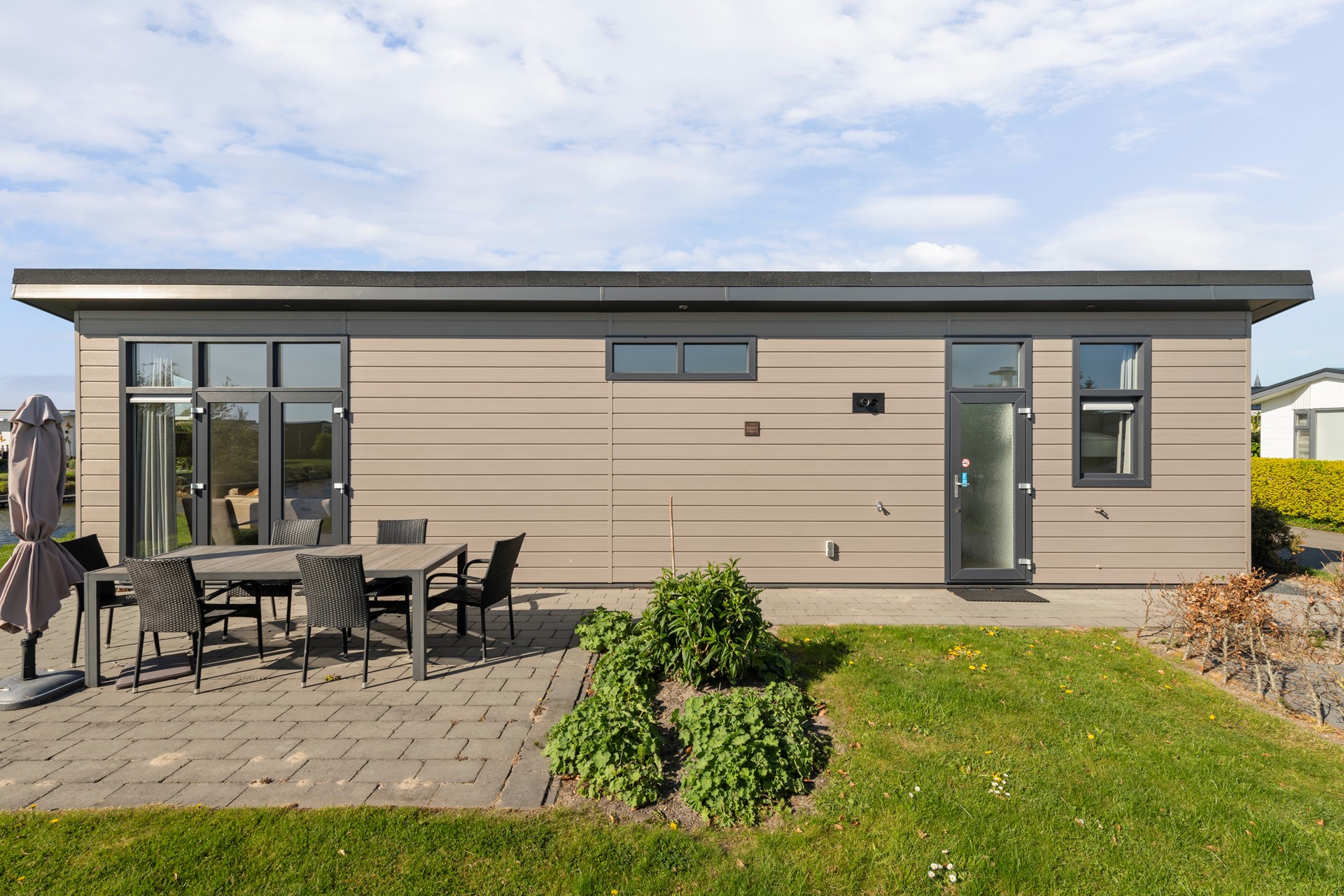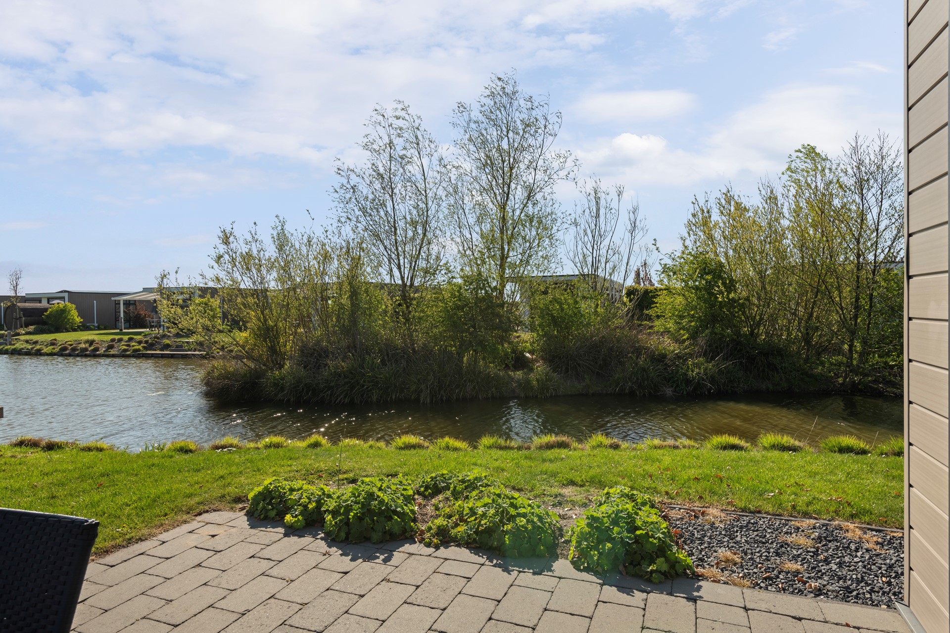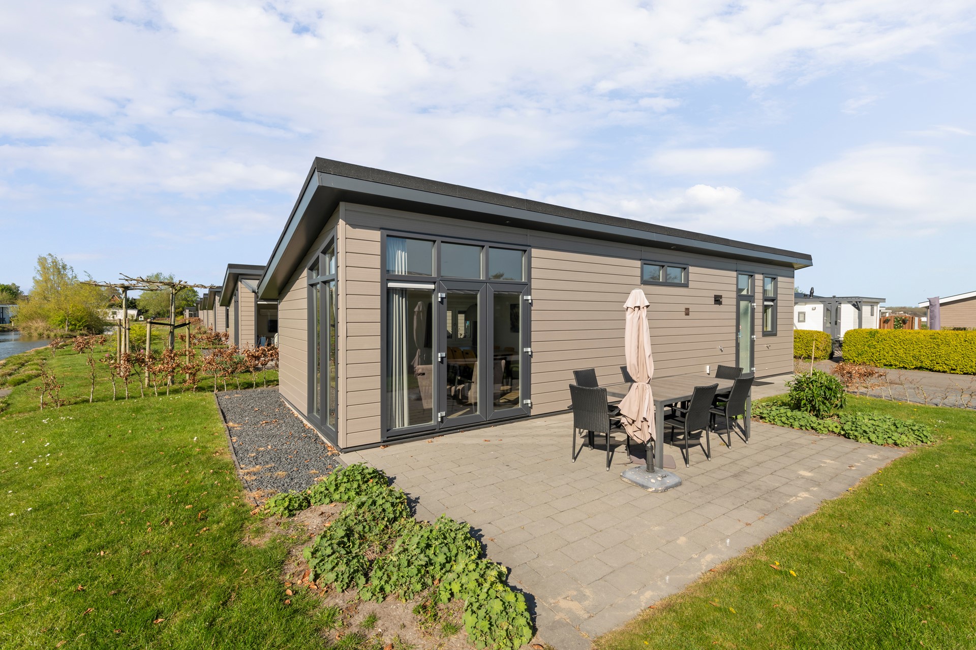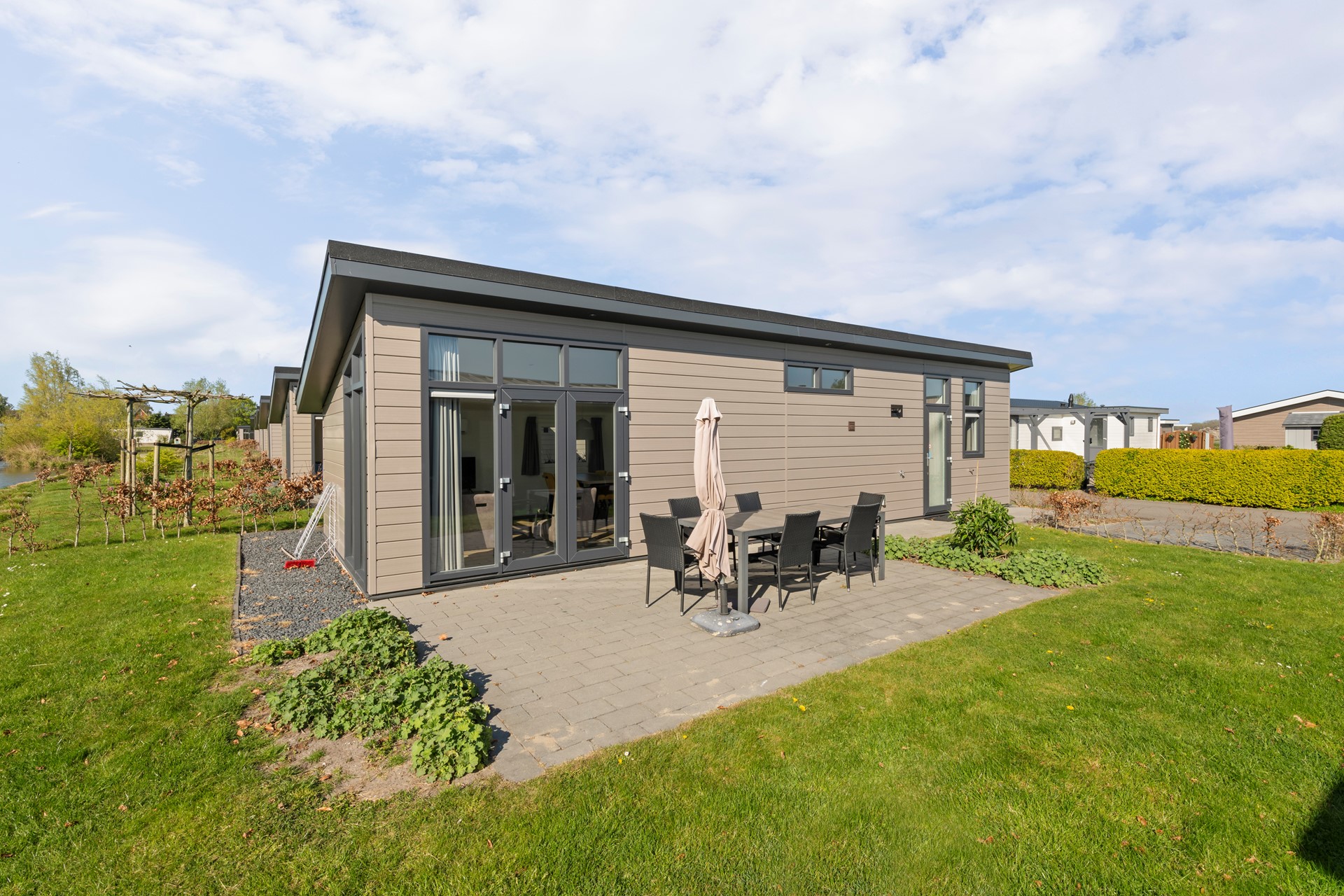 Het perceel is onderhoudsarm aangelegd en voorzien van een heerlijk terras met ruimte voor een comfortabele tuinset, waar u optimaal kunt genieten van het buitenleven. De tuin is daarnaast uitgerust met een zonnescherm en een sproei-installatie, wat zorgt voor extra comfort en gemak in het onderhoud. De woning is prachtig gelegen aan een waterpartij, wat zorgt voor een echt vakantiegevoel en een rustige, ontspannen sfeer. Daarnaast beschikt de woning over een eigen parkeerplaats direct bij de woning.