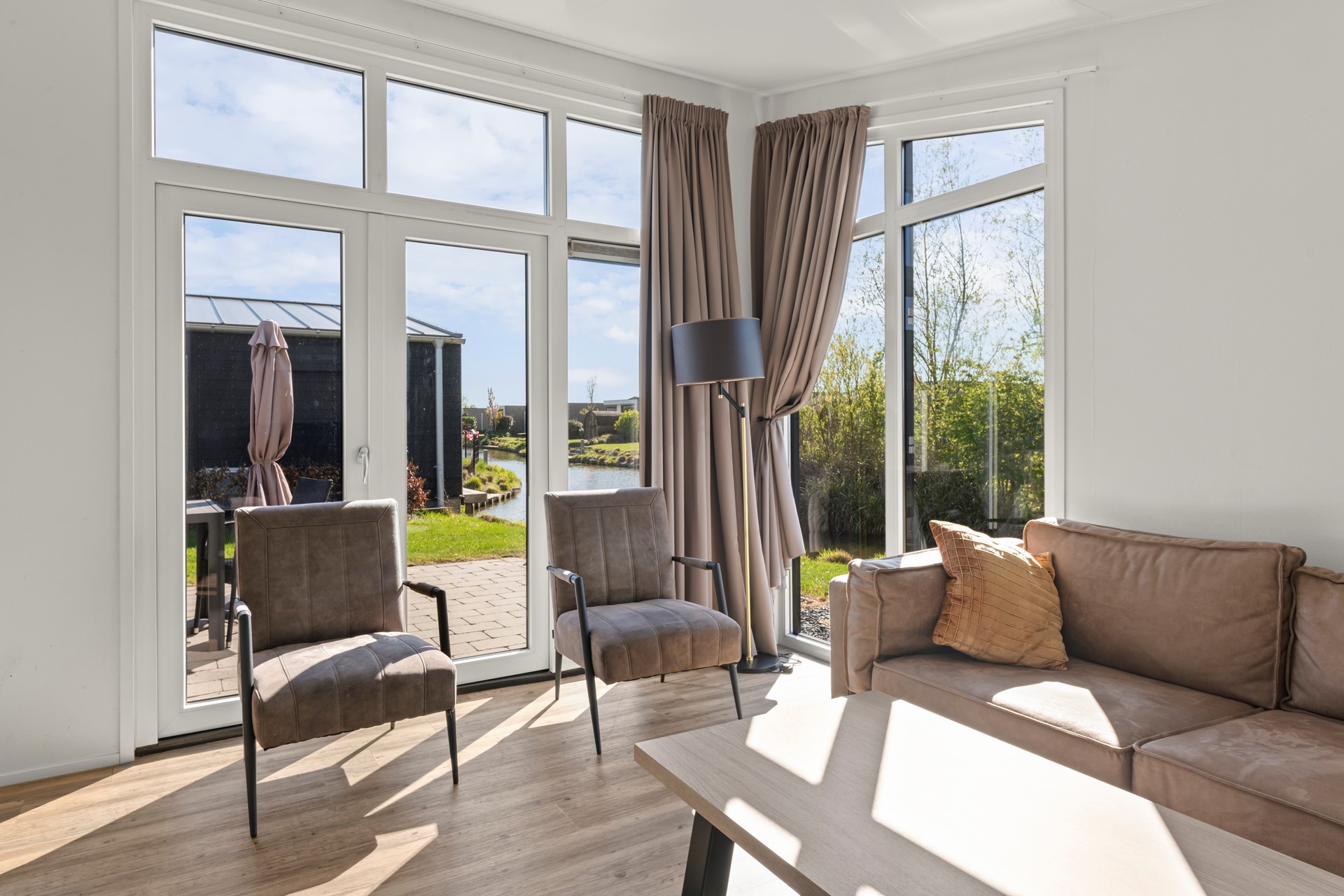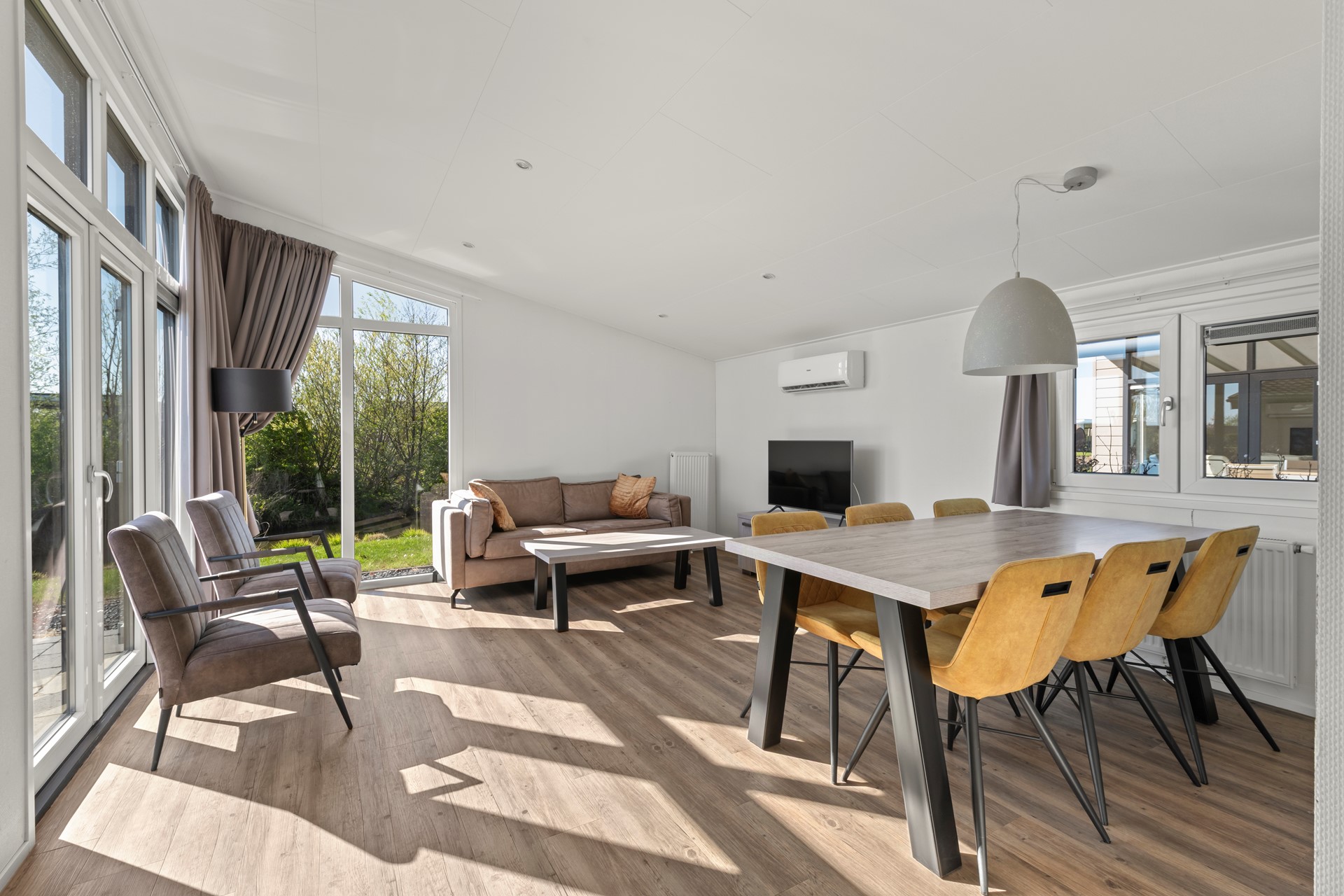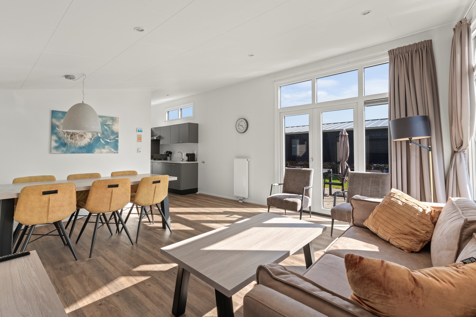 De open keuken is praktisch ingericht en voorzien van inbouwapparatuur en voldoende opbergruimte. De woonkamer voelt warm en uitnodigend aan, met voldoende plek om samen te dineren of te ontspannen. Daarnaast is de woonkamer voorzien van airconditioning, wat zorgt voor optimaal comfort gedurende het hele jaar. Via de openslaande deur in de woonkamer stapt u direct het terras op, waardoor binnen en buiten naadloos in elkaar overlopen.