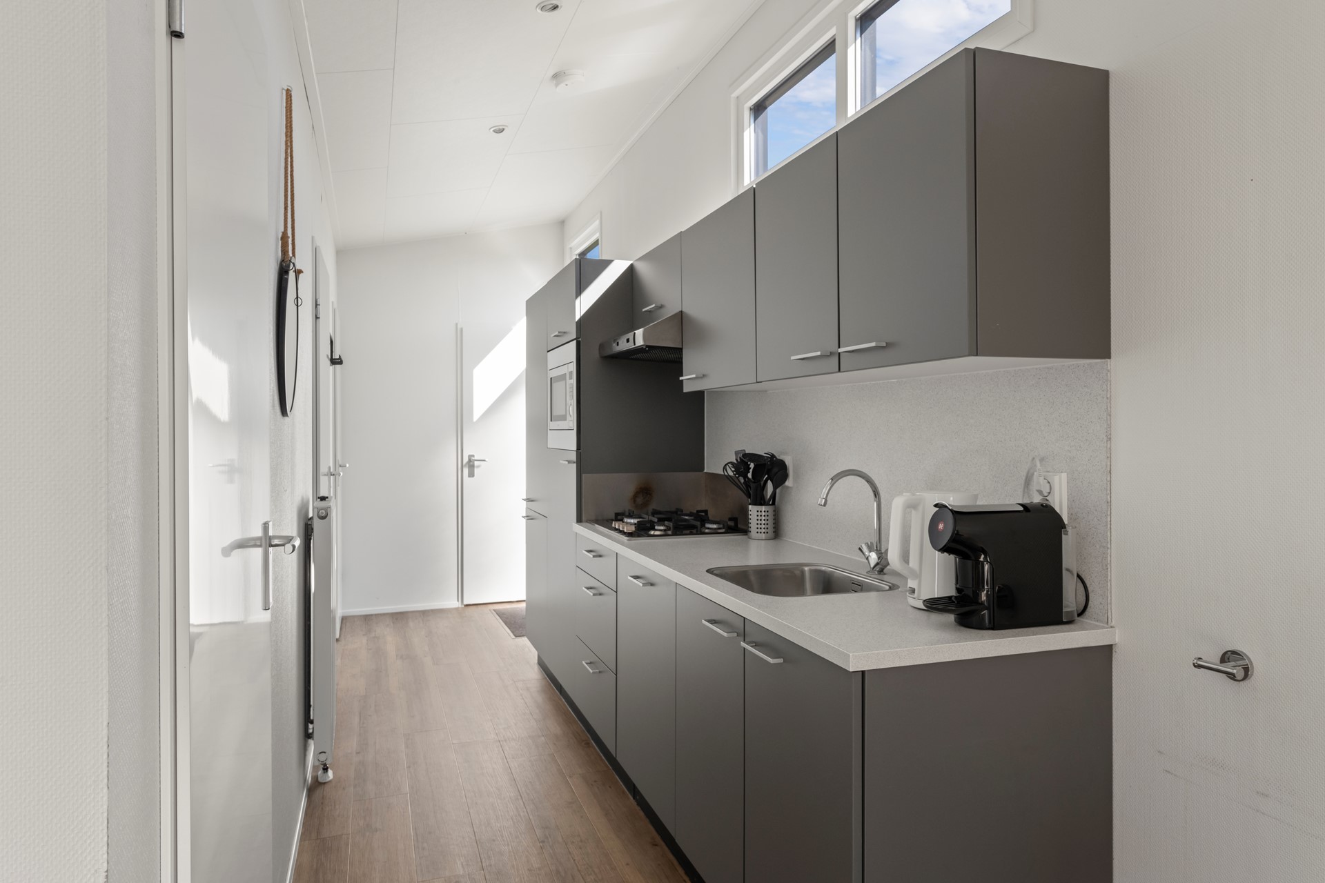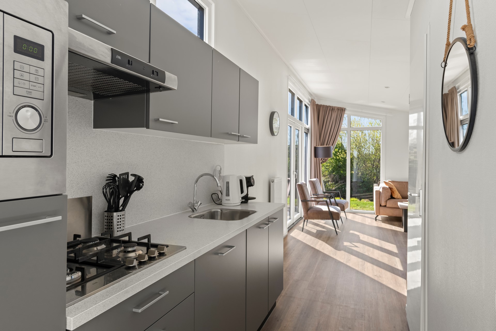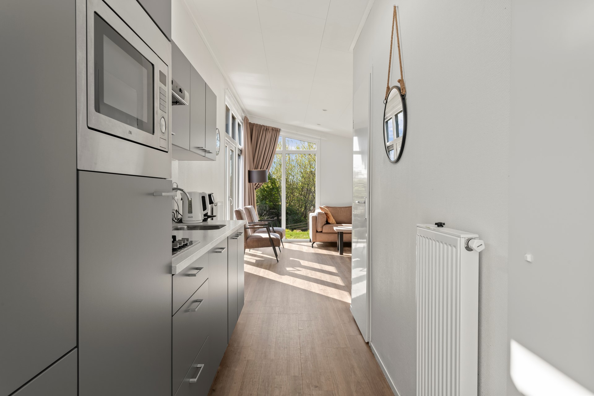 De open keuken is praktisch ingericht en voorzien van inbouwapparatuur en voldoende opbergruimte. De woonkamer voelt warm en uitnodigend aan, met voldoende plek om samen te dineren of te ontspannen. Daarnaast is de woonkamer voorzien van airconditioning, wat zorgt voor optimaal comfort gedurende het hele jaar. Via de openslaande deur in de woonkamer stapt u direct het terras op, waardoor binnen en buiten naadloos in elkaar overlopen.