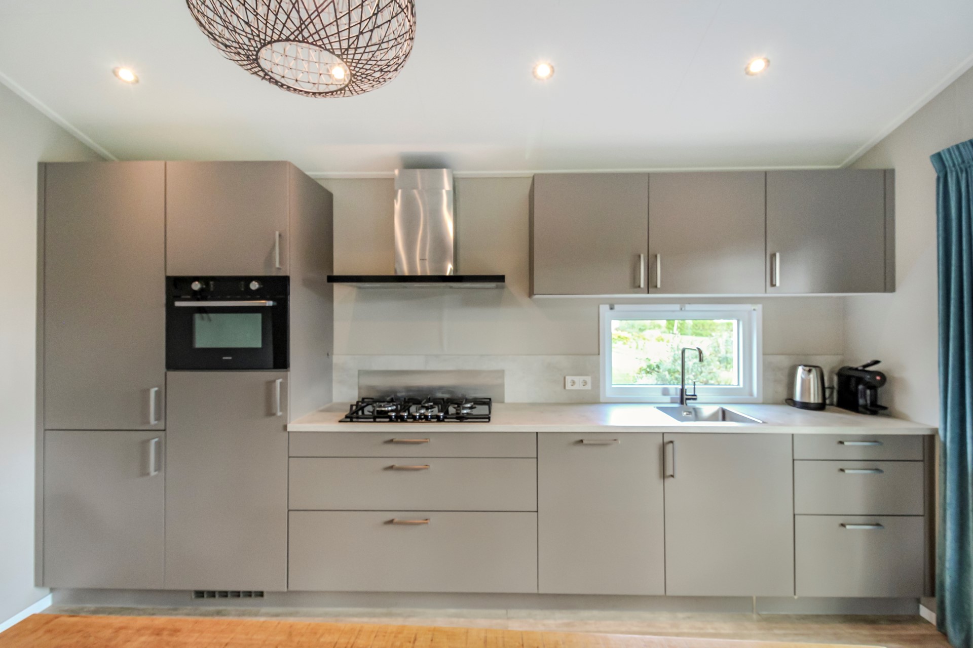 De open woonruimte vormt het hart van de woning. De luxe keuken is uitgerust met diverse inbouwapparatuur, waaronder een vaatwasser, koelkast met vriesvak en een combimagnetron met heteluchtovenfunctie. Het hoge plafond en de grote raampartijen geven het interieur een lichte, open uitstraling en bieden een prachtig uitzicht op de tuin. Via de openslaande deuren loopt u zo het terras op, een heerlijke plek om te ontspannen of gezellig samen te eten.