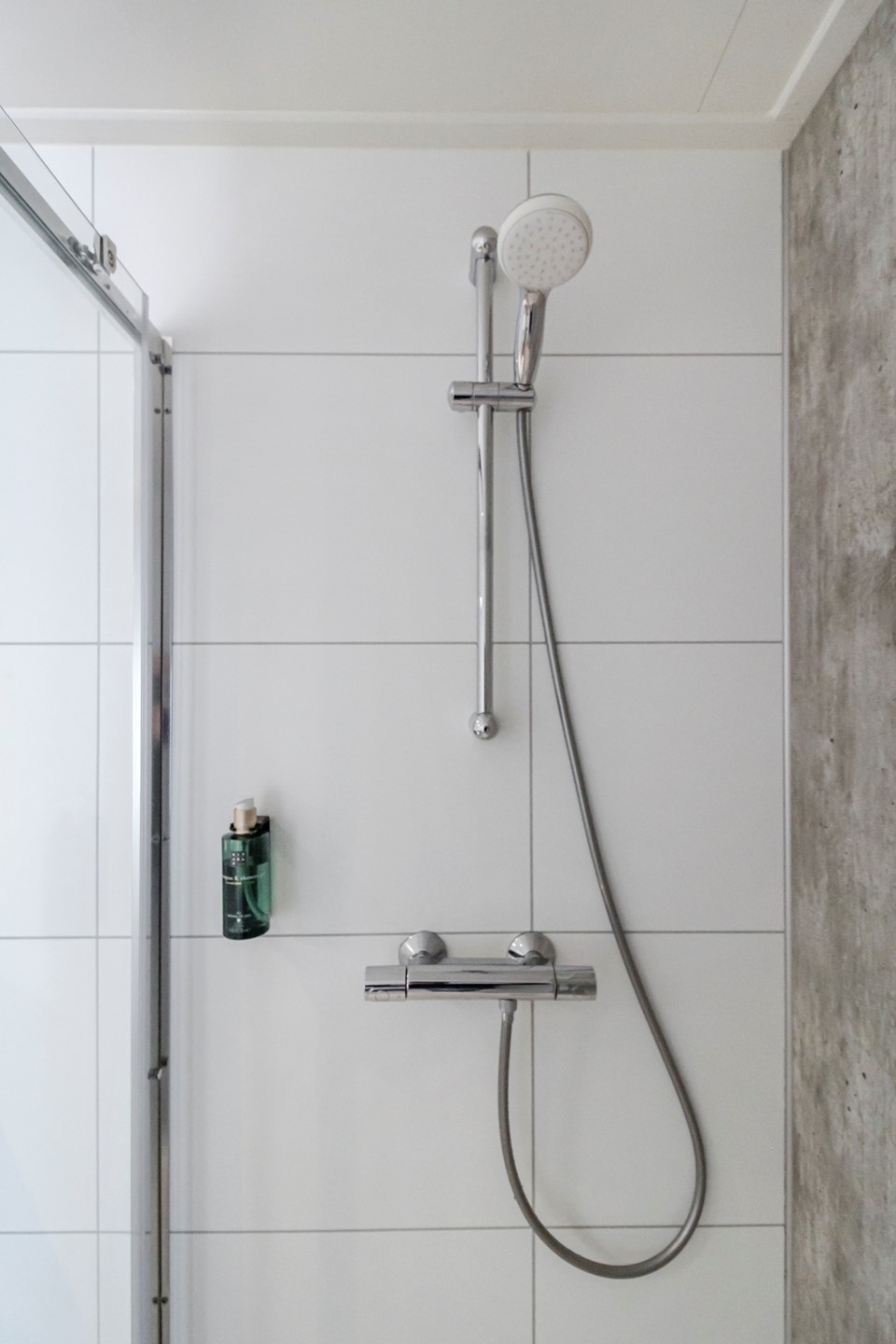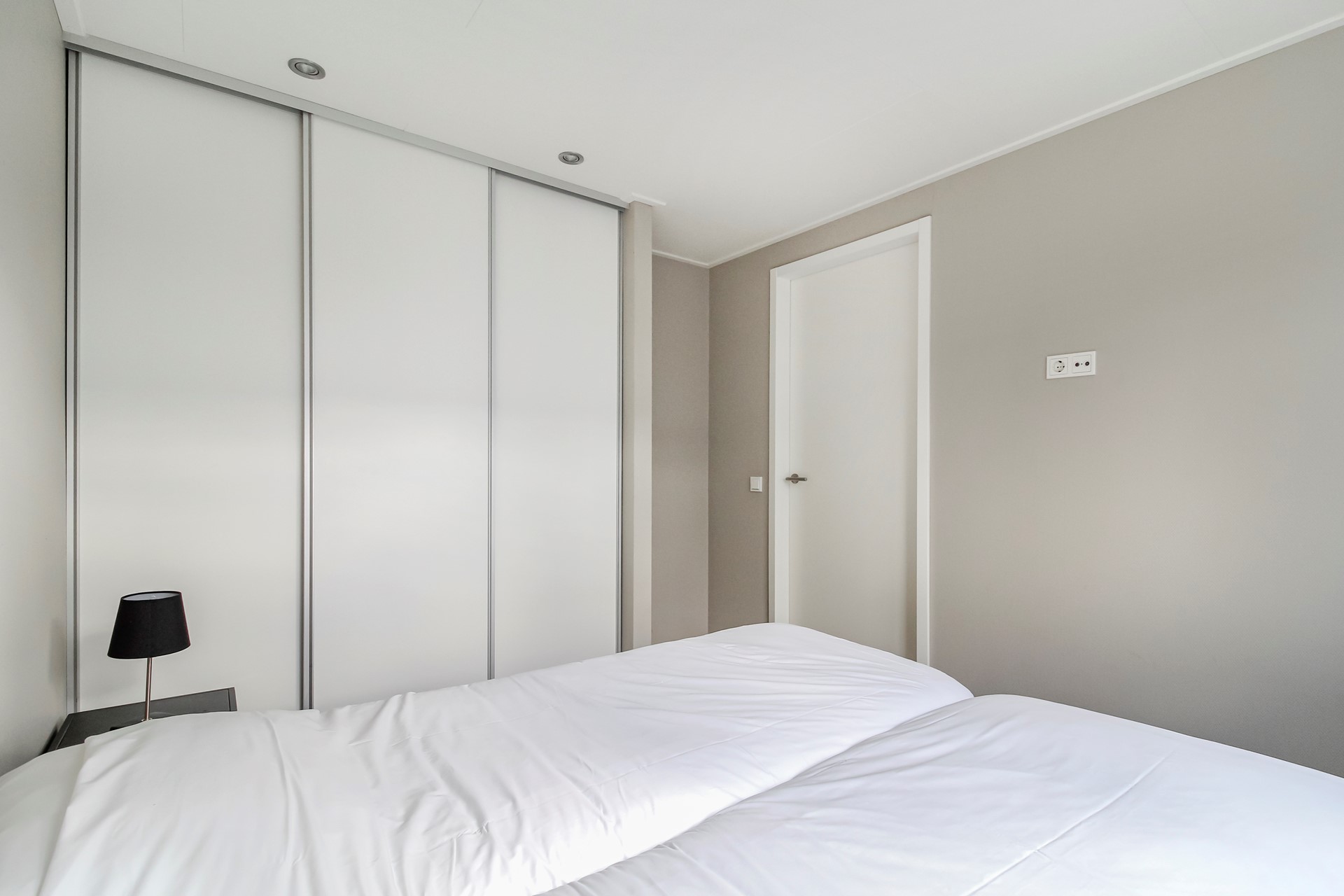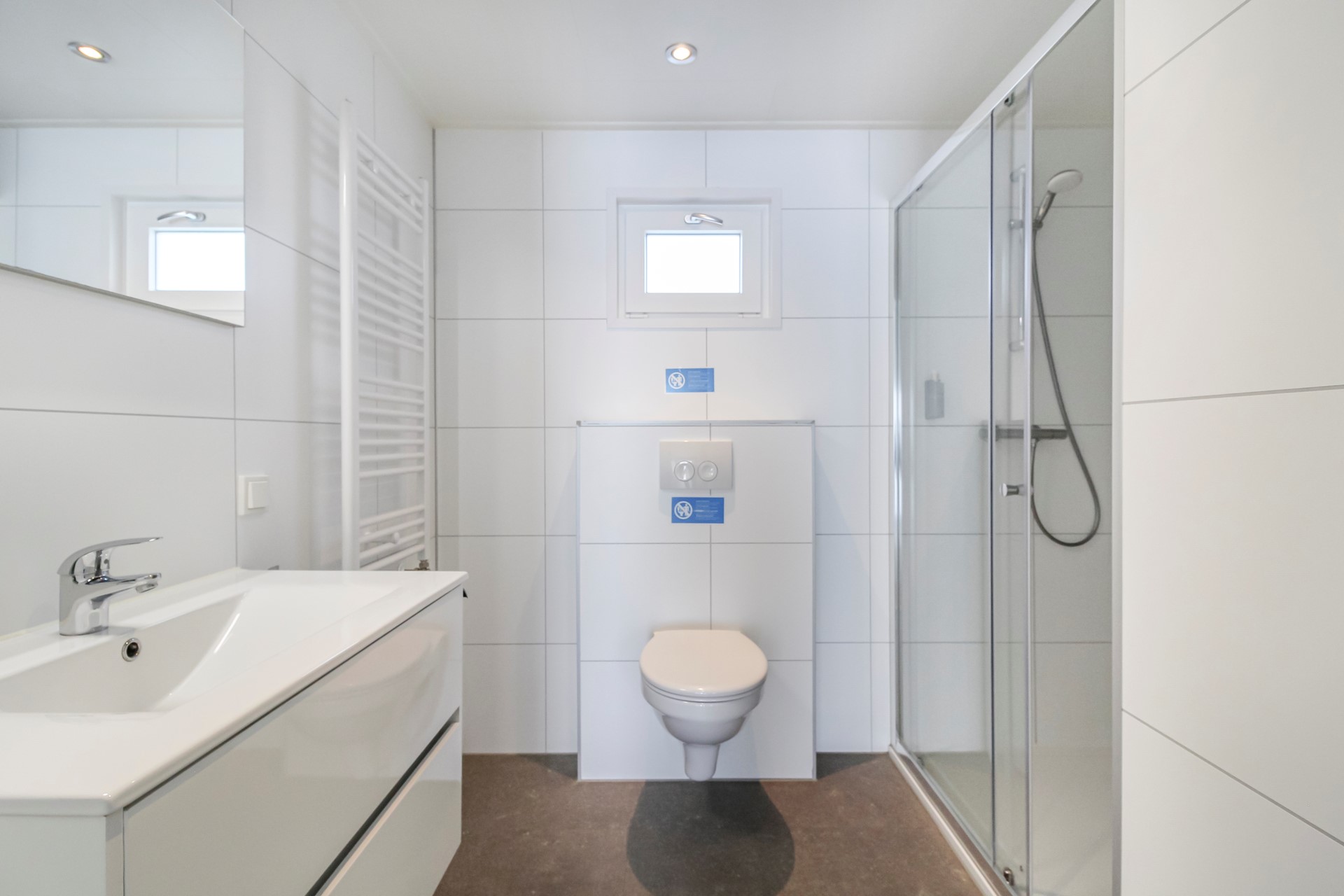 De badkamer is uitgevoerd in een tijdloos kleurenpalet van wit en antraciet en is praktisch en onderhoudsarm ingericht, ideaal voor zowel eigen gebruik als verhuur. De ruimte is voorzien van een modern wastafelmeubel, designradiator, ruime douchecabine met glazen schuifdeur en een toilet. Daarnaast is er een separaat toilet aanwezig.