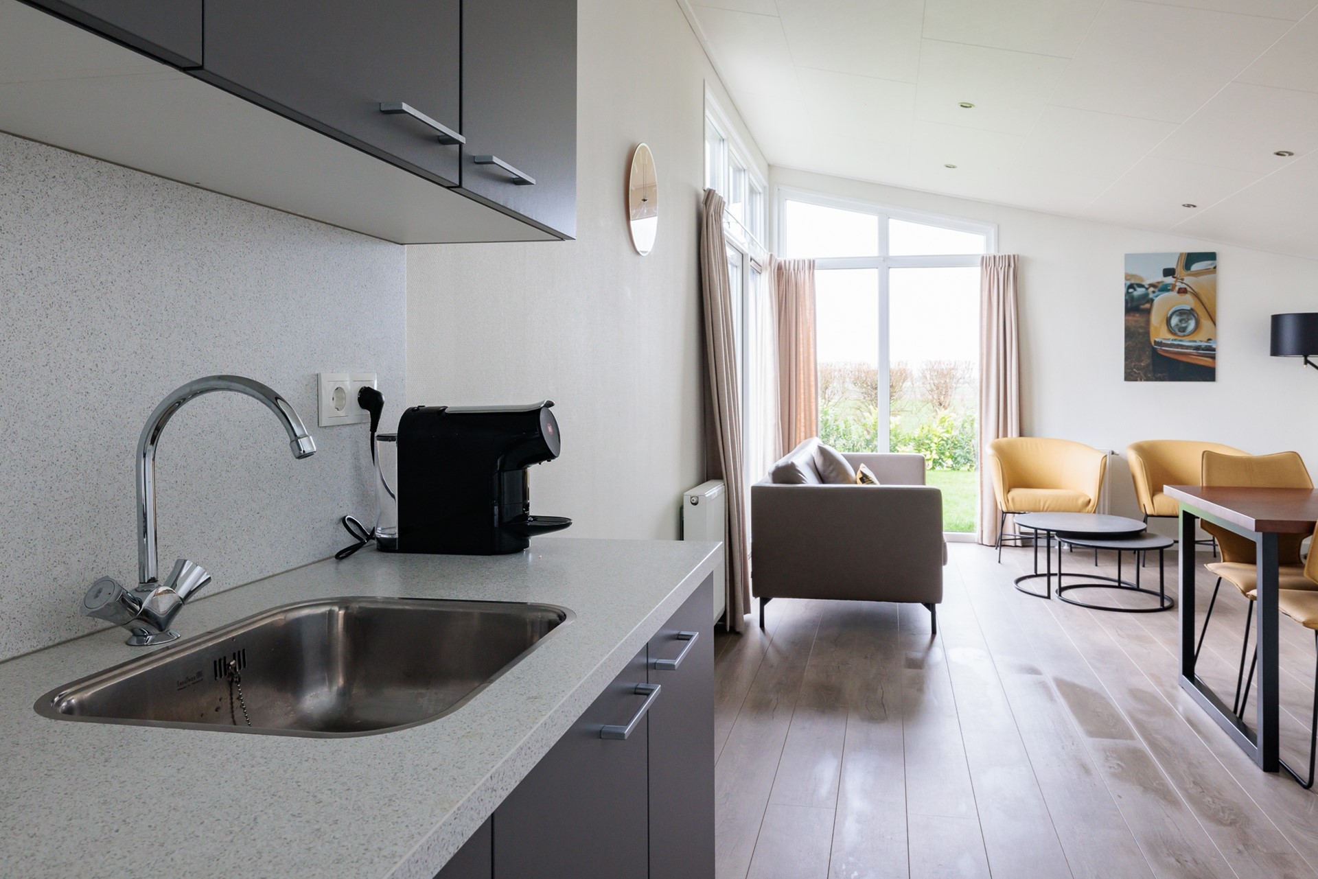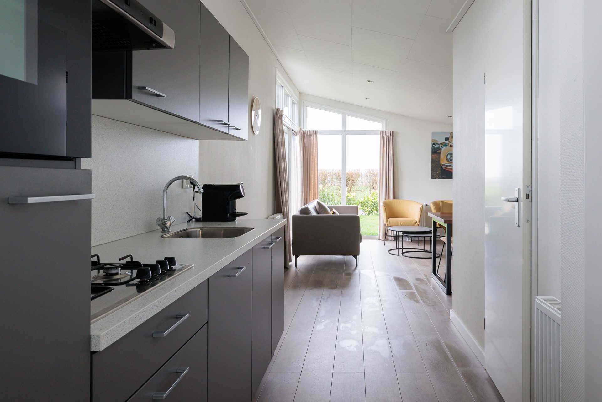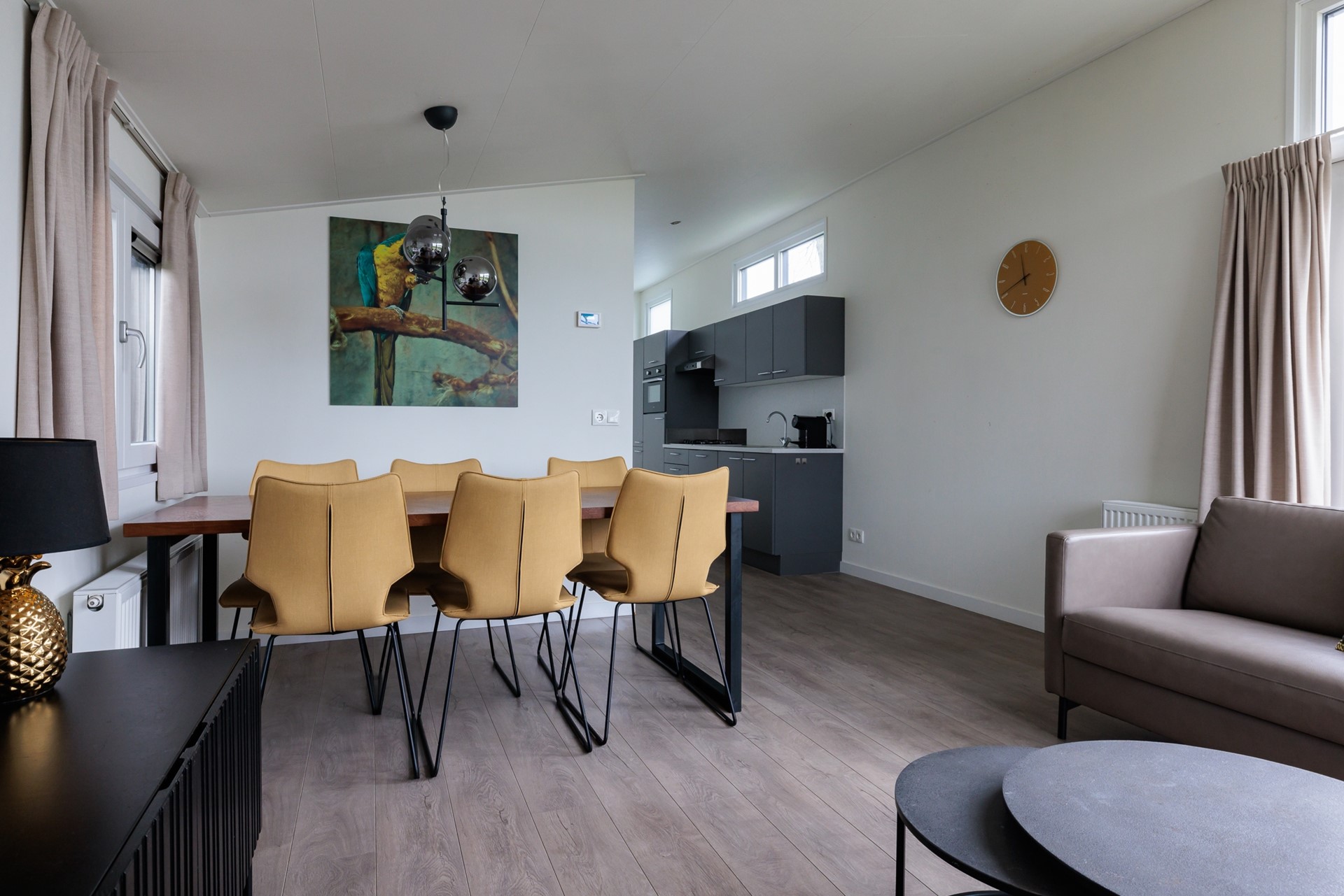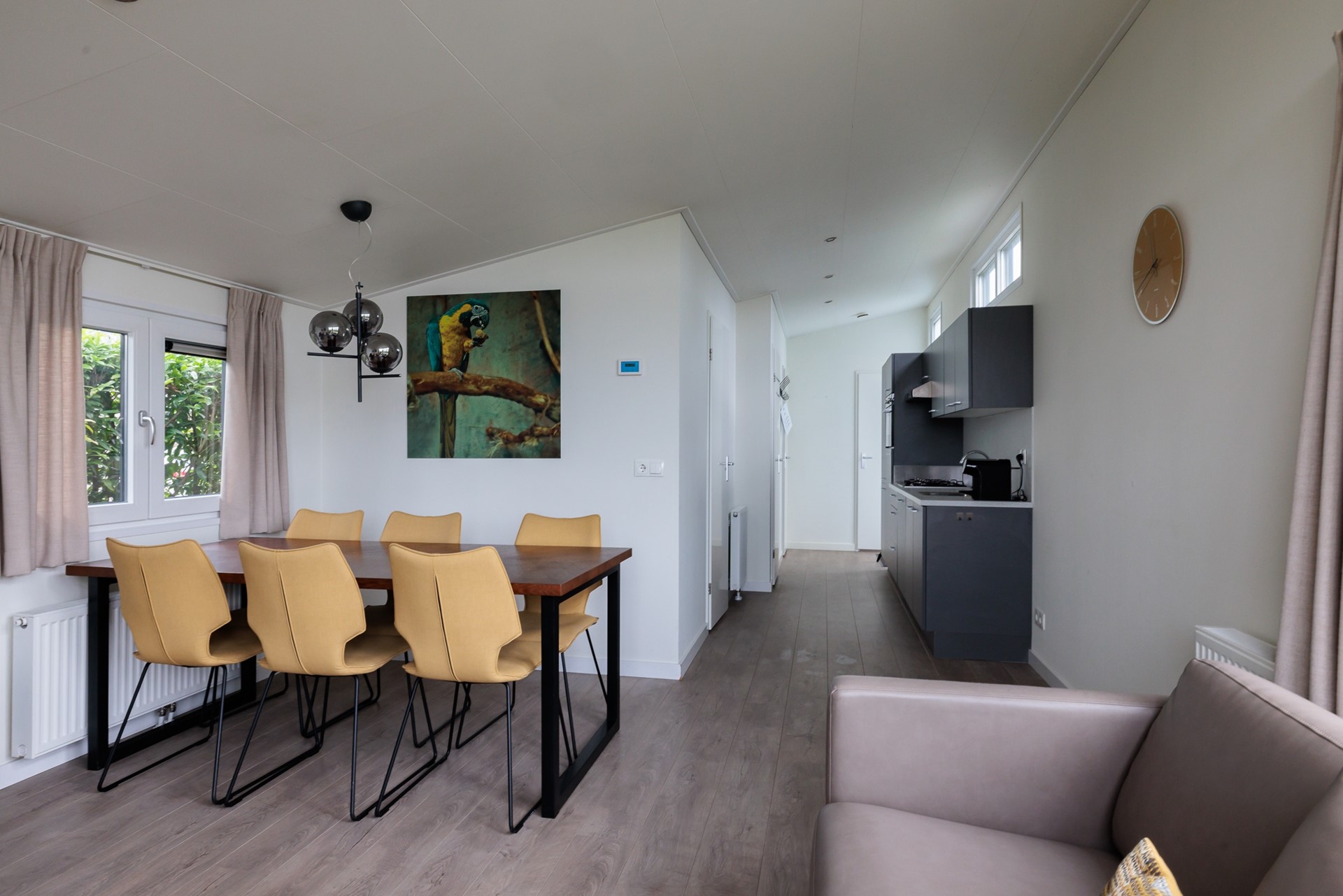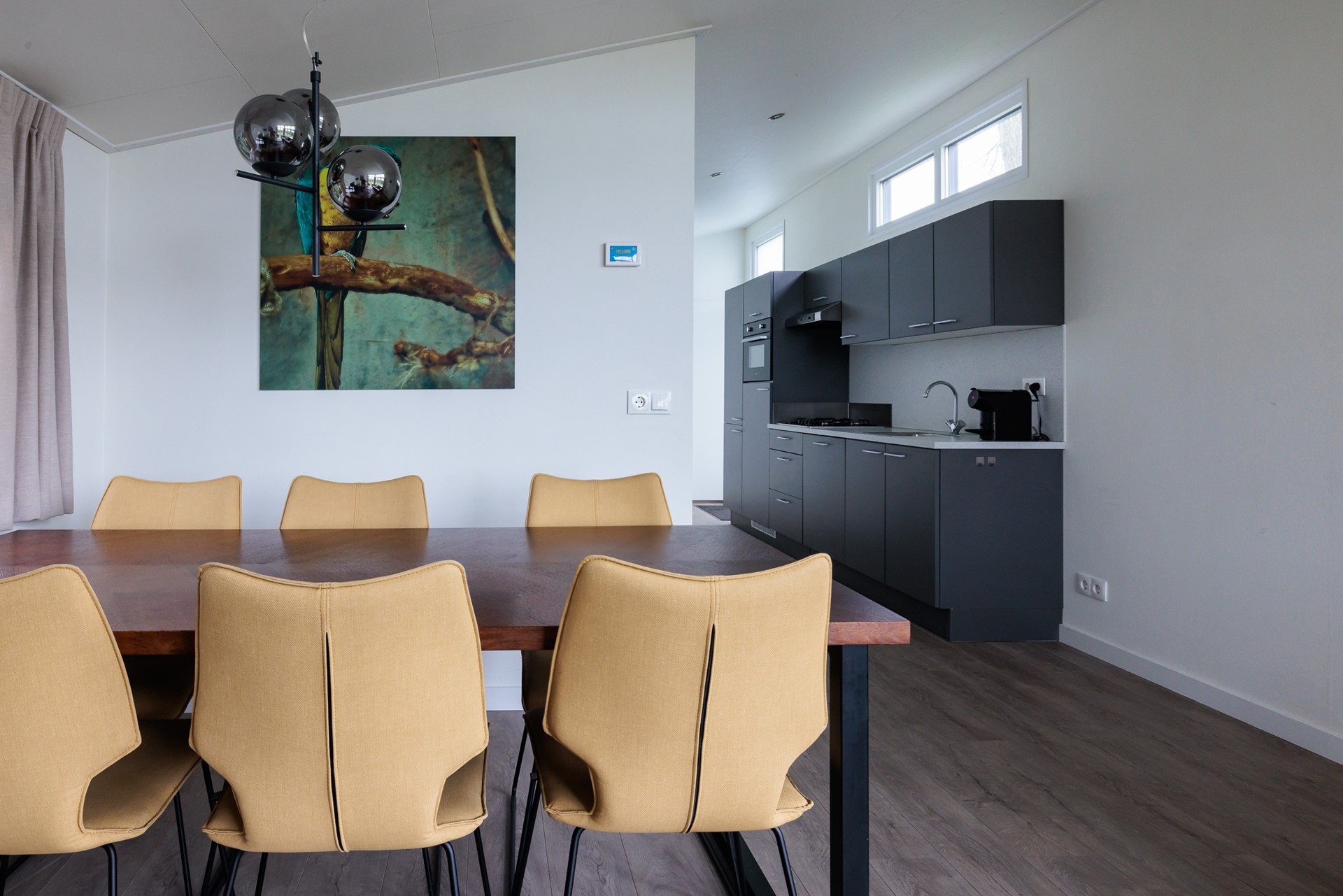 Zodra u binnenstapt, valt de ruime, lichte woonkamer op. Grote raampartijen, openslaande deuren naar het terras en een hoge nok creëren een bijzonder prettig binnenklimaat. De woonkamer biedt plaats aan een royale zithoek en eethoek, perfect om samen te komen na een dag buiten.