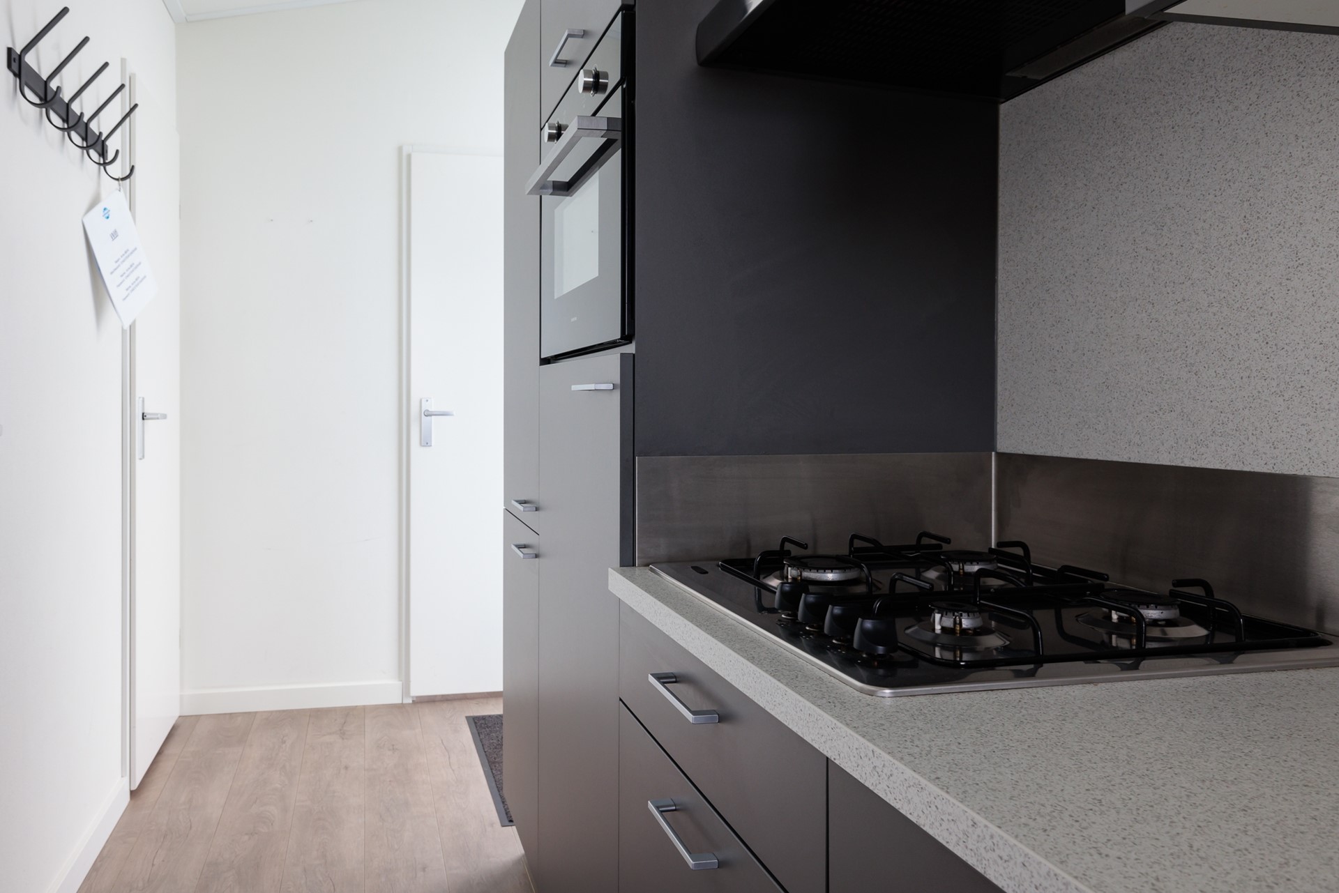 De open keuken sluit naadloos aan op het interieur en is uitgerust met moderne inbouwapparatuur, waaronder een combimagnetron met heteluchtfunctie, vaatwasser en veel werk- en bergruimte. De stijlvolle donkere fronten geven een luxe uitstraling.