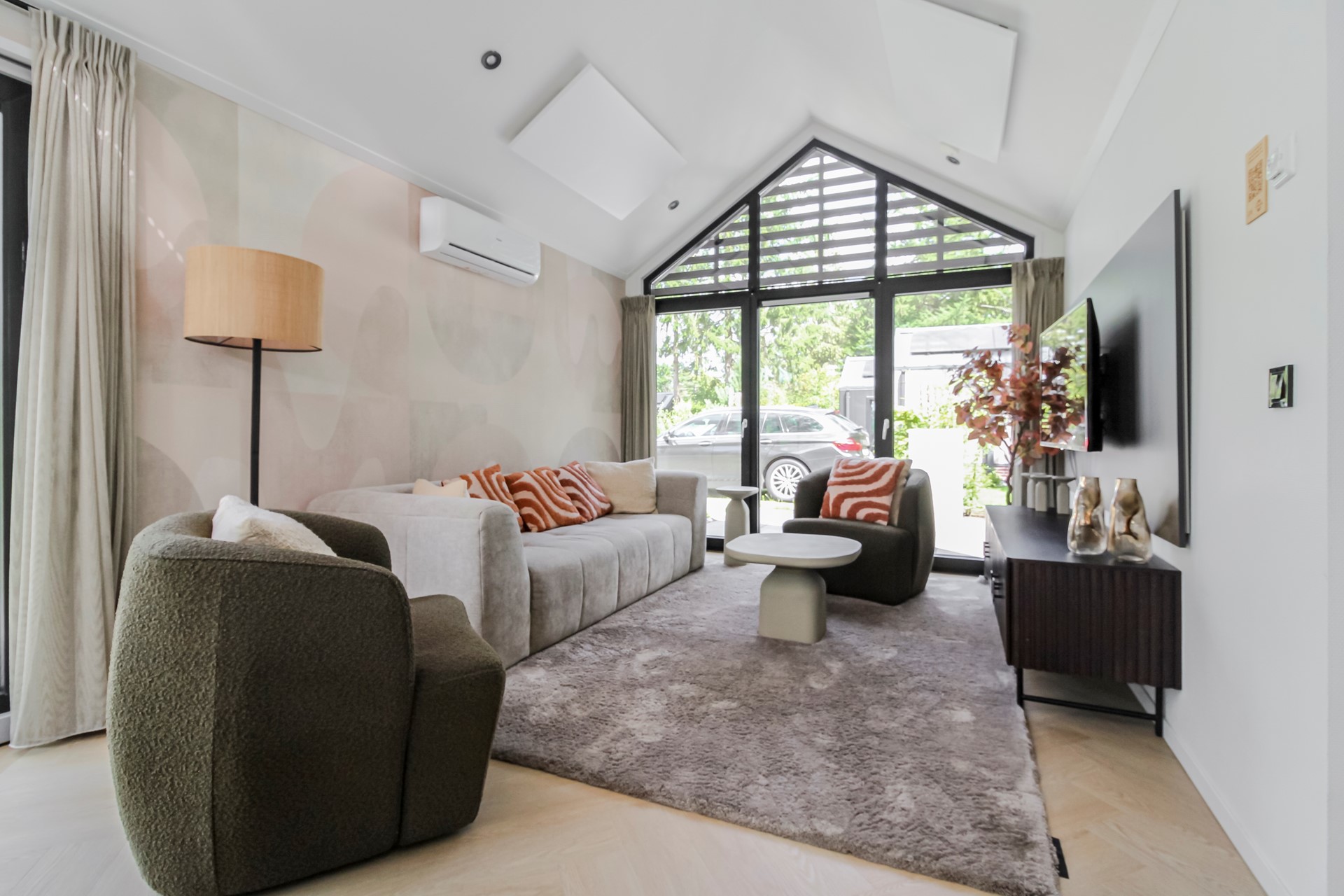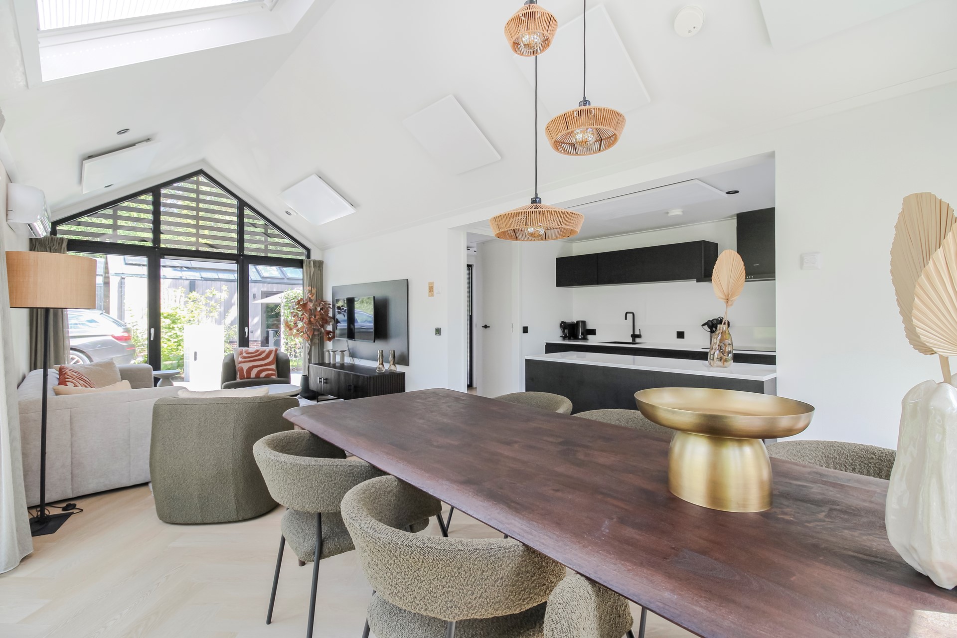 Binnen geniet u van een sfeervolle en lichte leefruimte met hoge plafonds, grote ramen en slimme dakramen die de zon tot diep in de woning laten schijnen. De inrichting is warm en modern, met een fijne balans tussen luxe en functionaliteit. Dankzij de aanwezige airco blijft het ook op zomerse dagen heerlijk koel binnen.