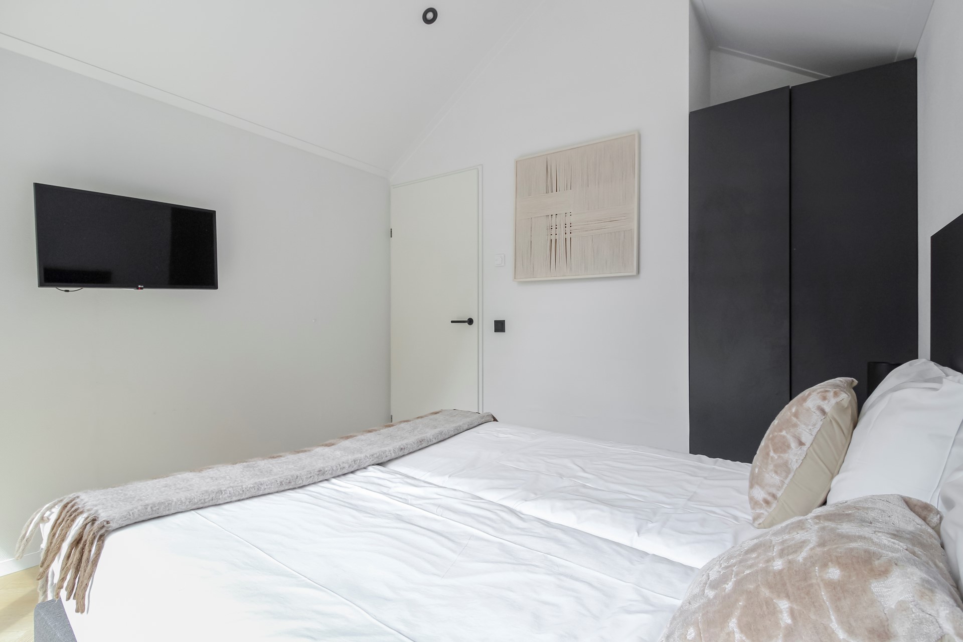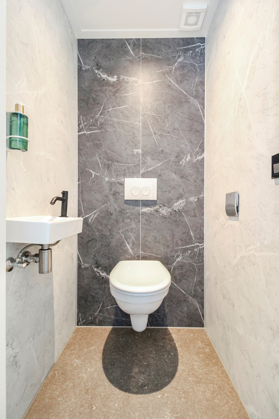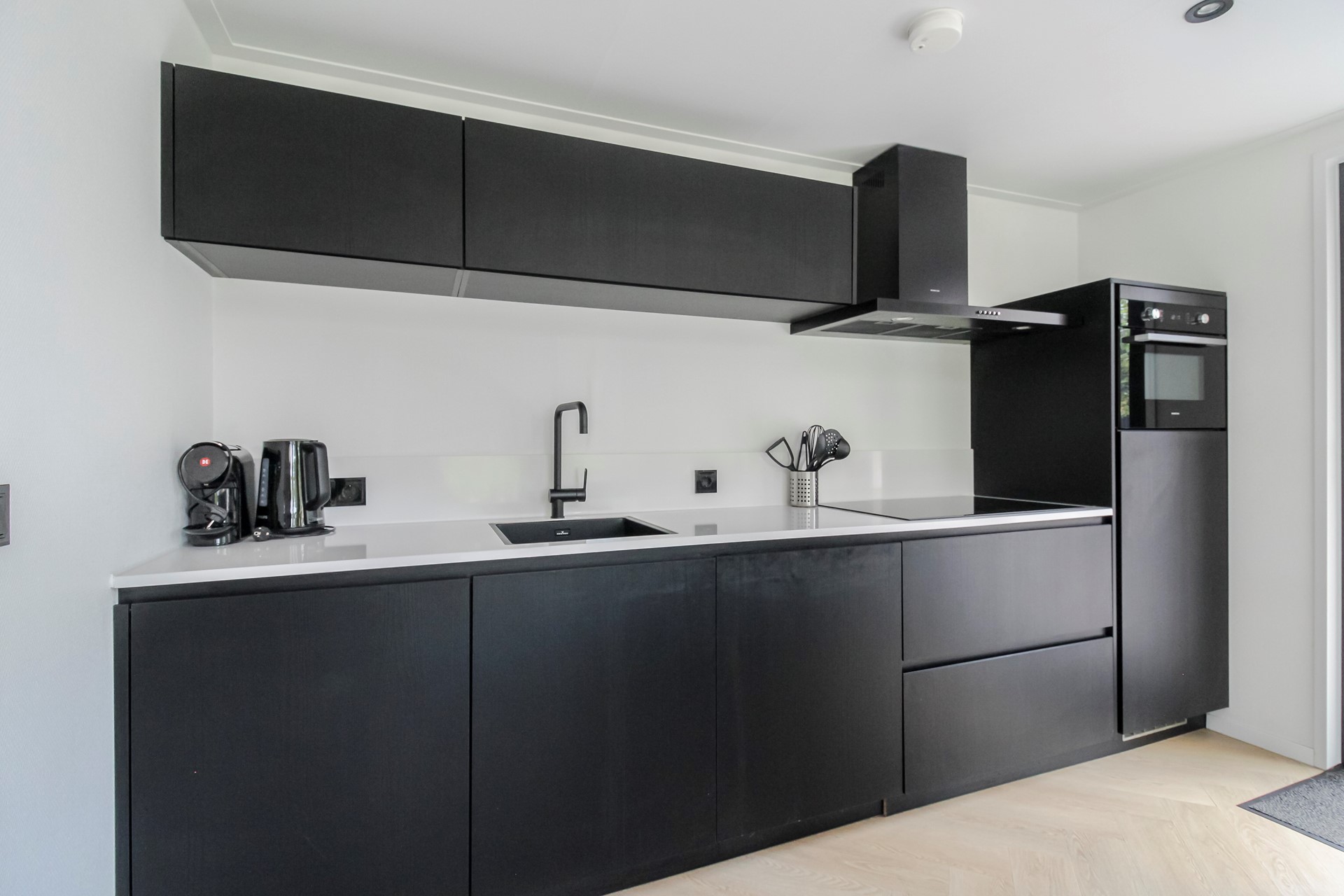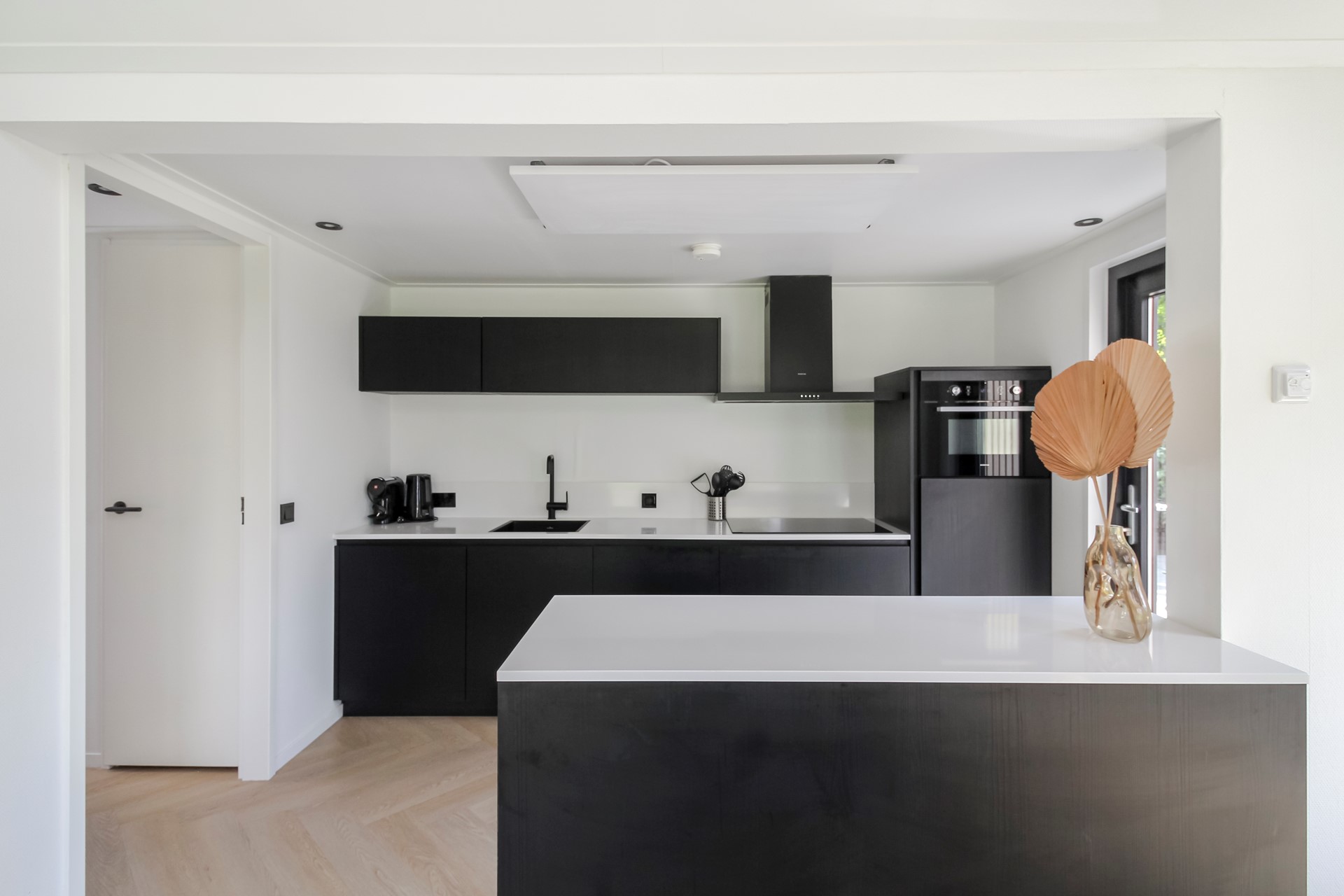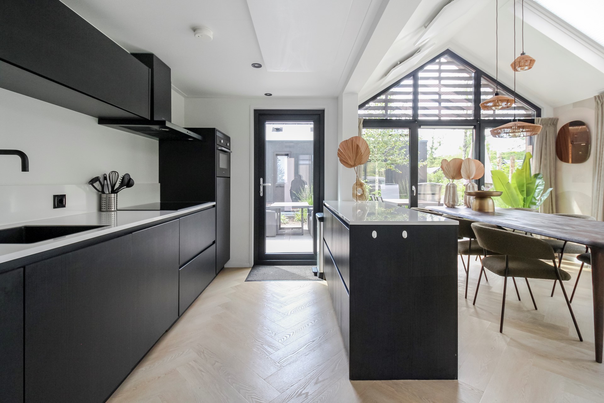 De keuken is strak en stijlvol uitgevoerd met matzwarte fronten, een hardstenen werkblad en hoogwaardige inbouwapparatuur. U vindt hier alles wat u nodig heeft: een inductiekookplaat, combi-oven, koelkast, vaatwasser én een wijnklimaatkast – ideaal voor culinaire avonden met vrienden of familie.