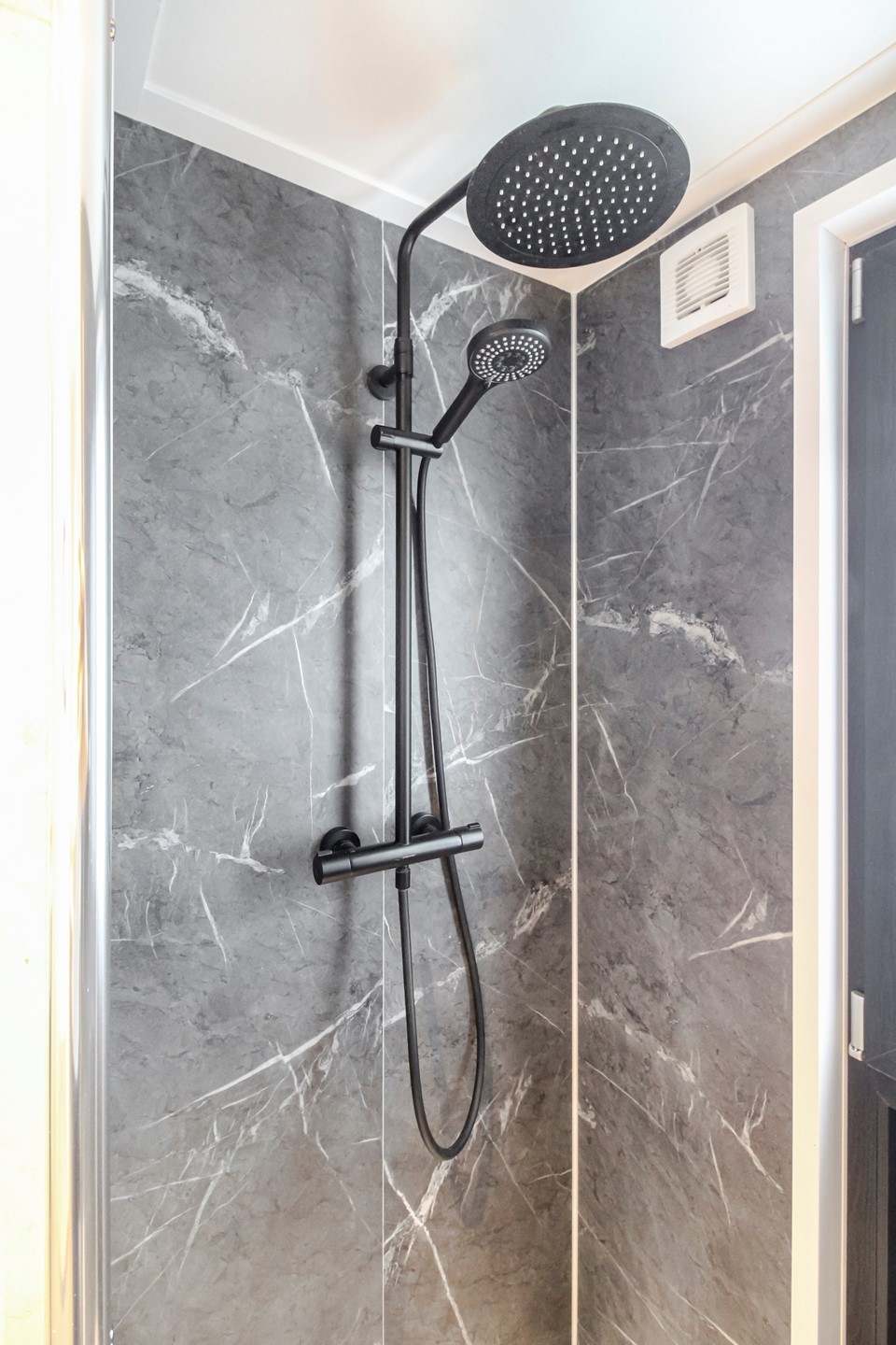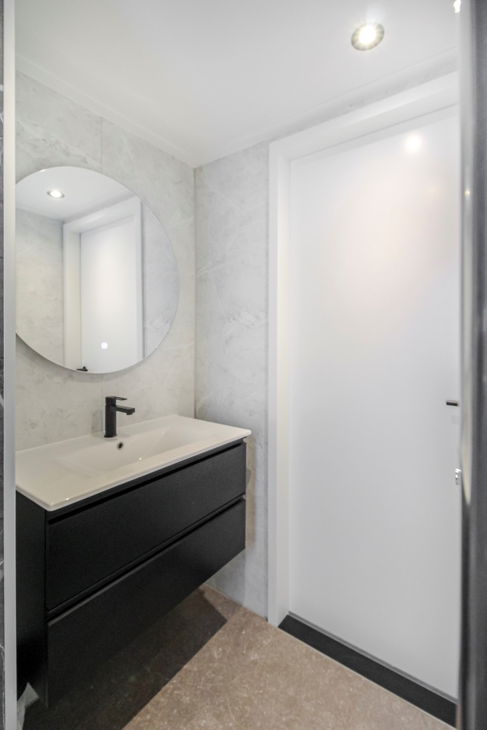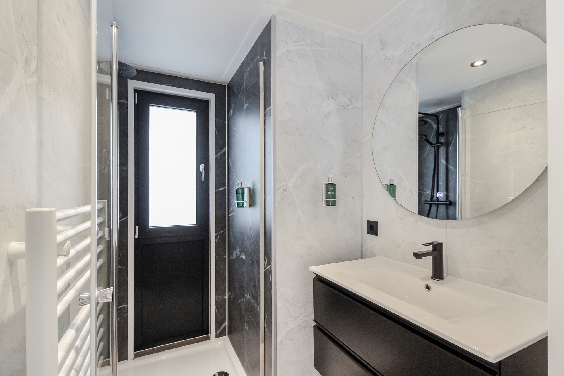 De badkamer is modern en fris, met een inloopdouche voorzien van een regendouche, een brede wastafel met verlichte spiegel en stijlvolle zwarte accenten. Het toilet is separaat en in dezelfde luxe stijl afgewerkt.