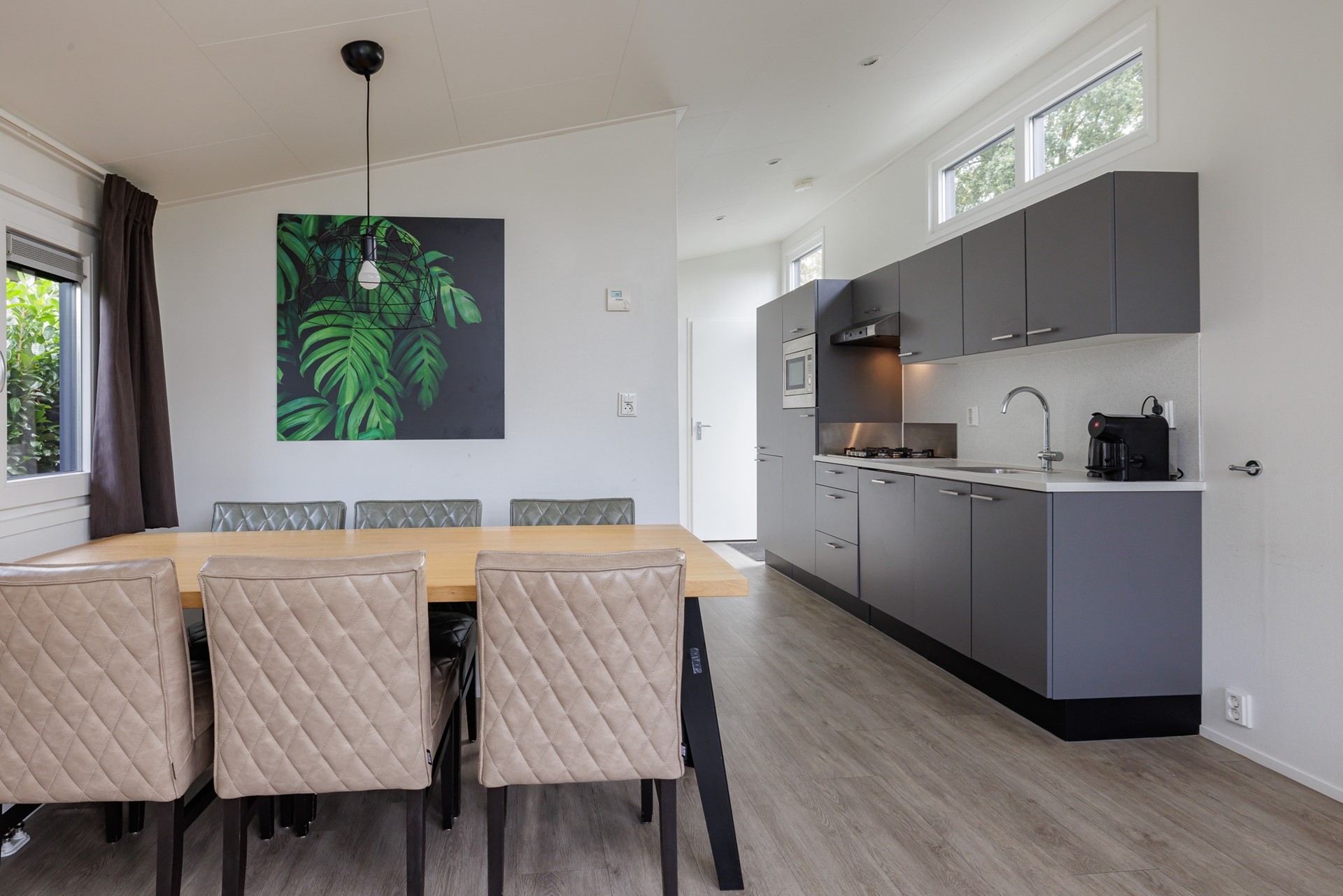 Het hart van de woning wordt gevormd door een stijlvolle open keuken, gevolgd door een comfortabele zithoek en eethoek. Grote raampartijen laten het daglicht rijkelijk binnenstromen, terwijl het hellende dak zorgt voor extra sfeer en een warme, uitnodigende uitstraling. Dankzij airconditioning is het hier het hele jaar door aangenaam verblijven.