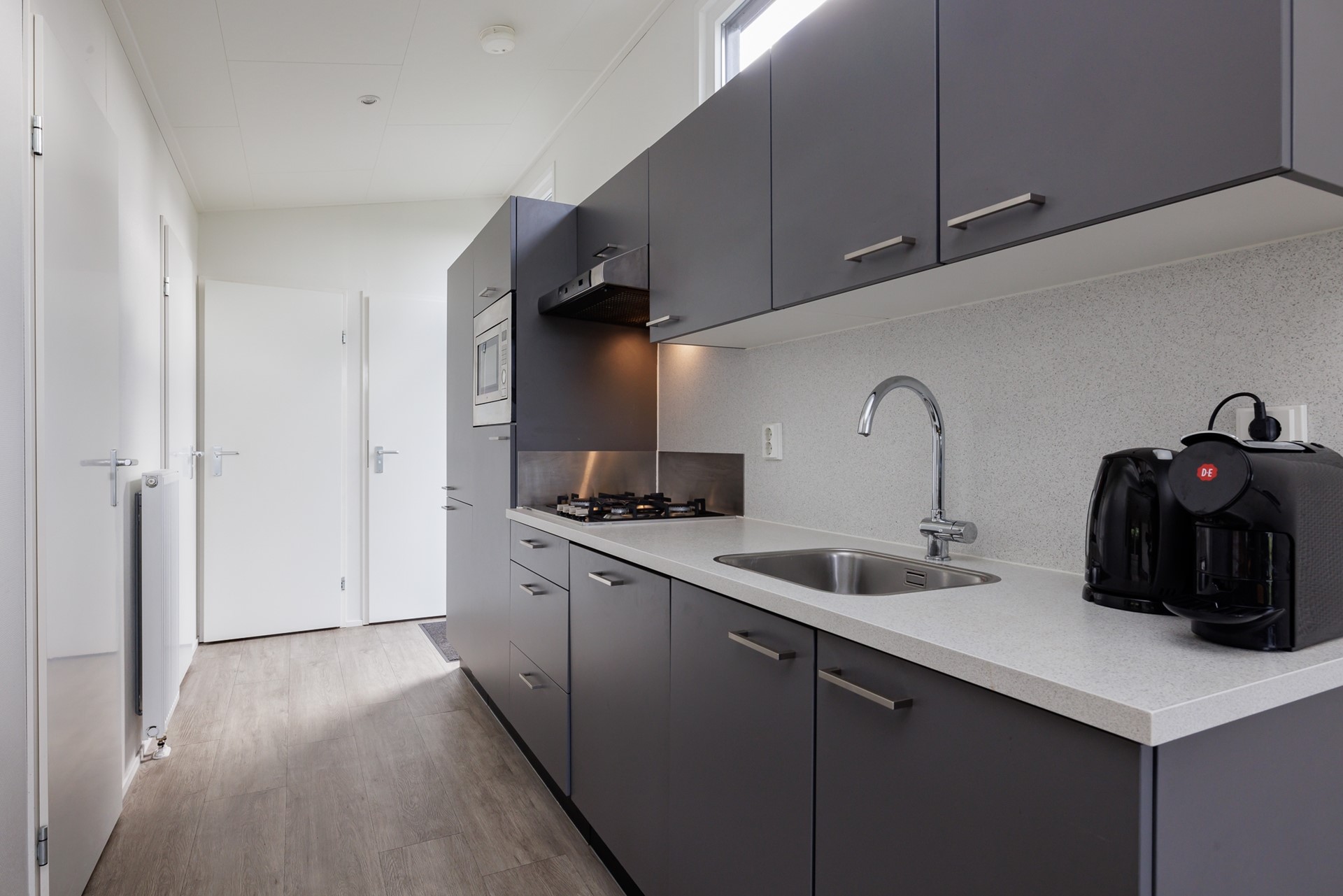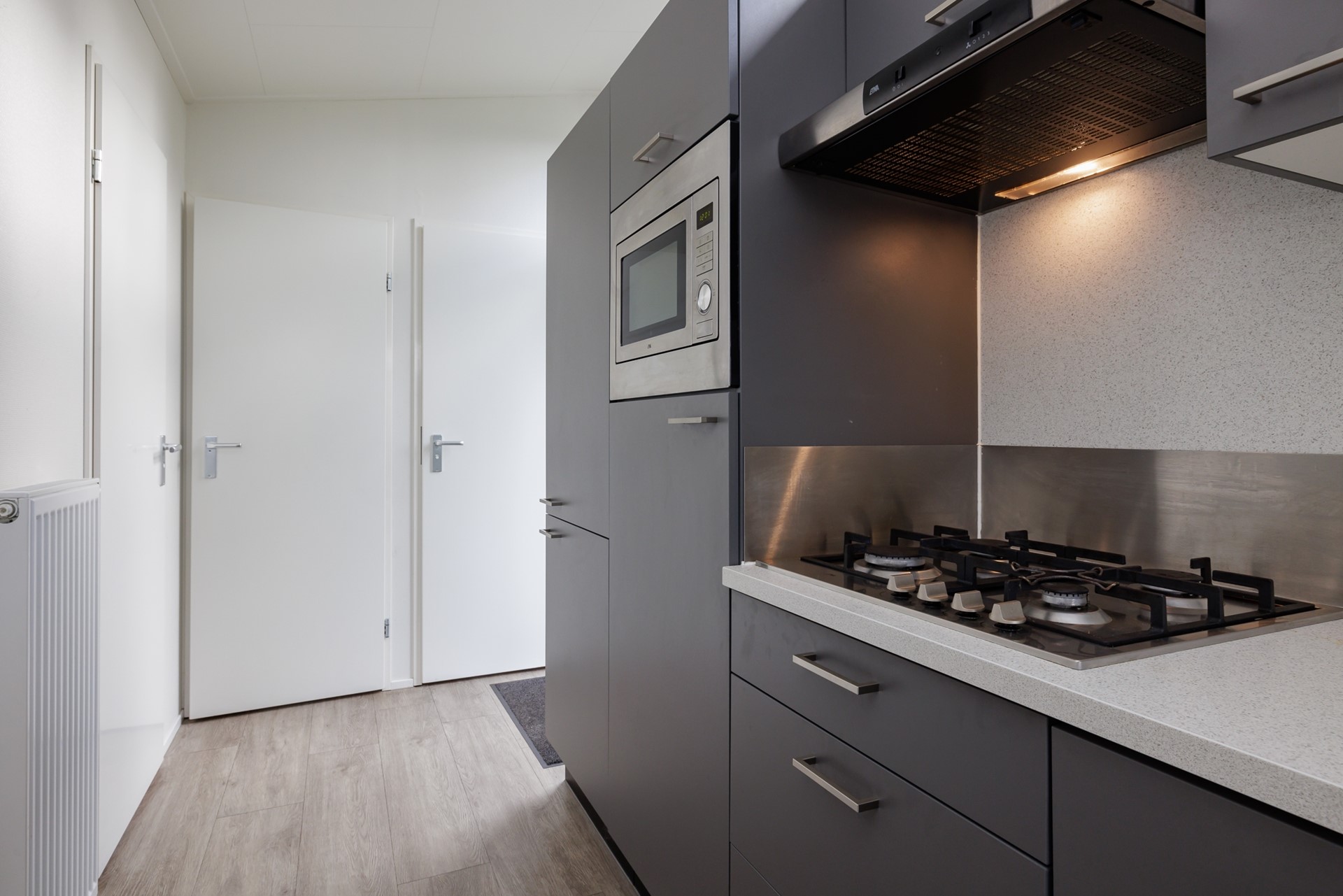 De keuken is uitgevoerd in een tijdloze combinatie van wit en antraciet en biedt volop werk- en bergruimte. Voorzien van moderne inbouwapparatuur zoals een vaatwasser, combi-oven/magnetron, gasfornuis, koelkast en vriezer, is koken hier een waar plezier.