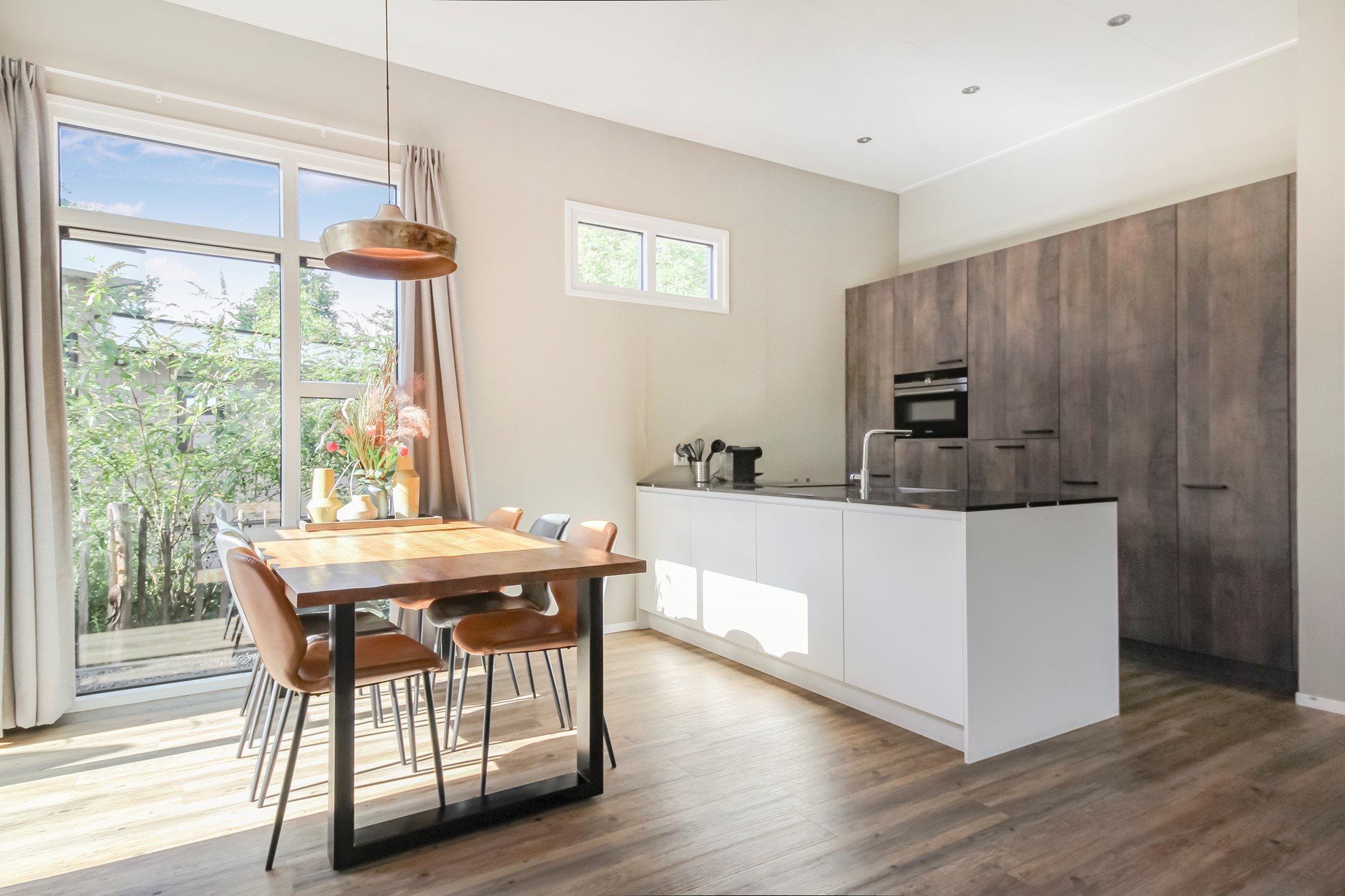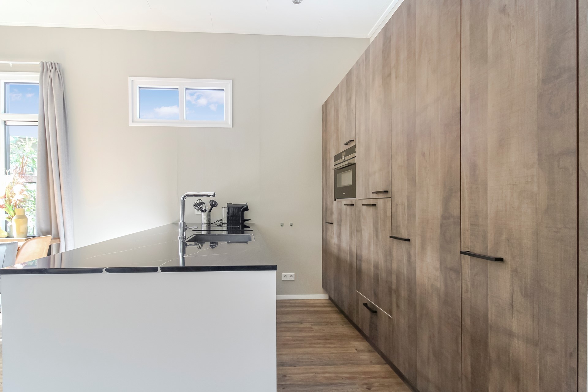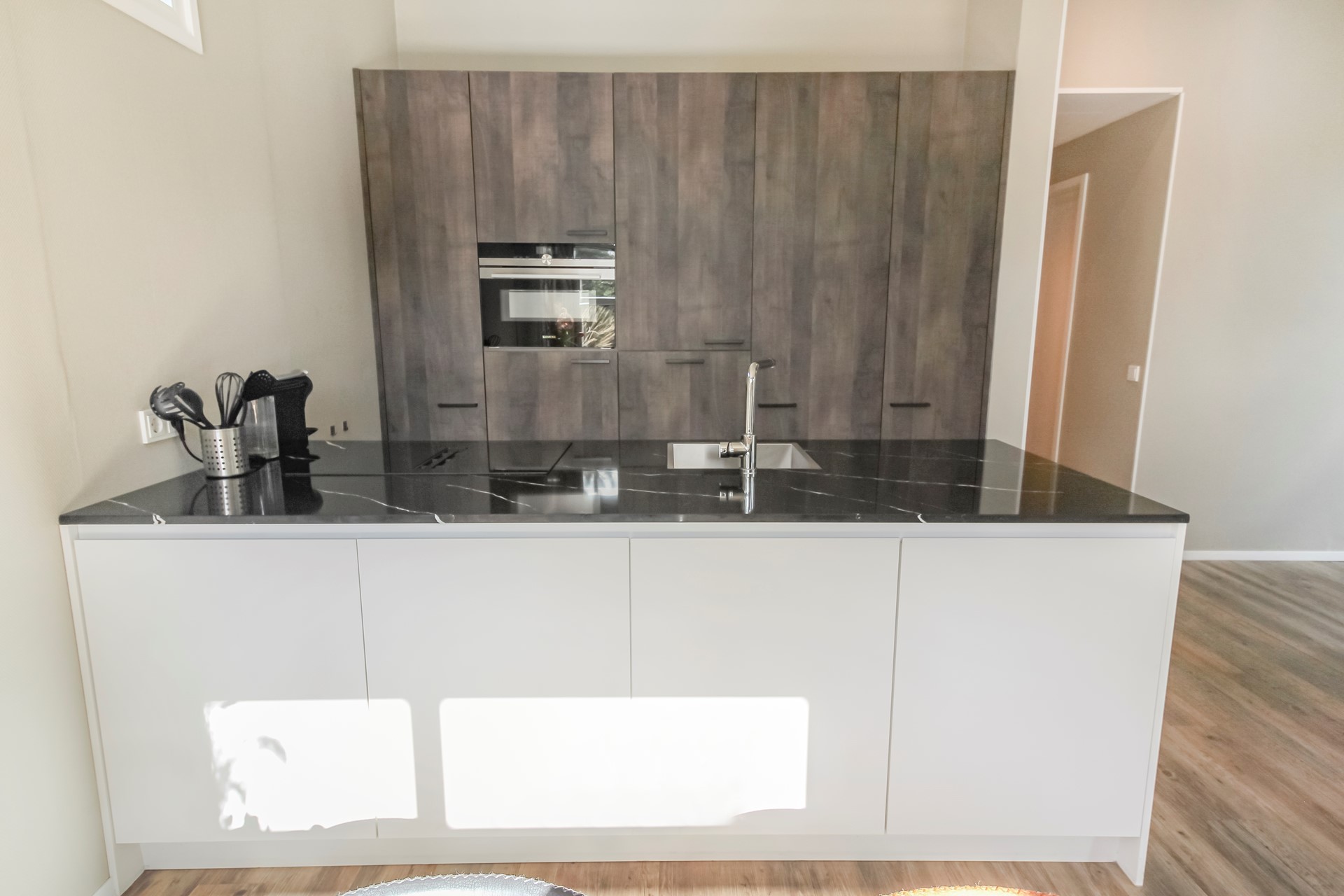 De keuken is een echte eyecatcher: het witte keukeneiland steekt prachtig af tegen de achterwand met een natuurlijk houtlook. De keuken is uitgerust met hoogwaardige inbouwapparatuur en biedt volop kastruimte, ideaal voor het bereiden van heerlijke maaltijden.