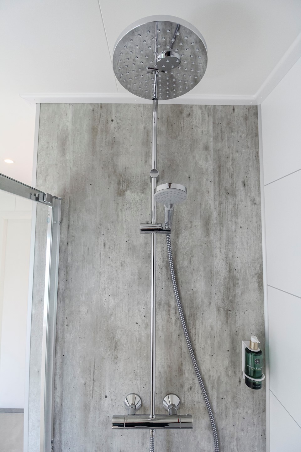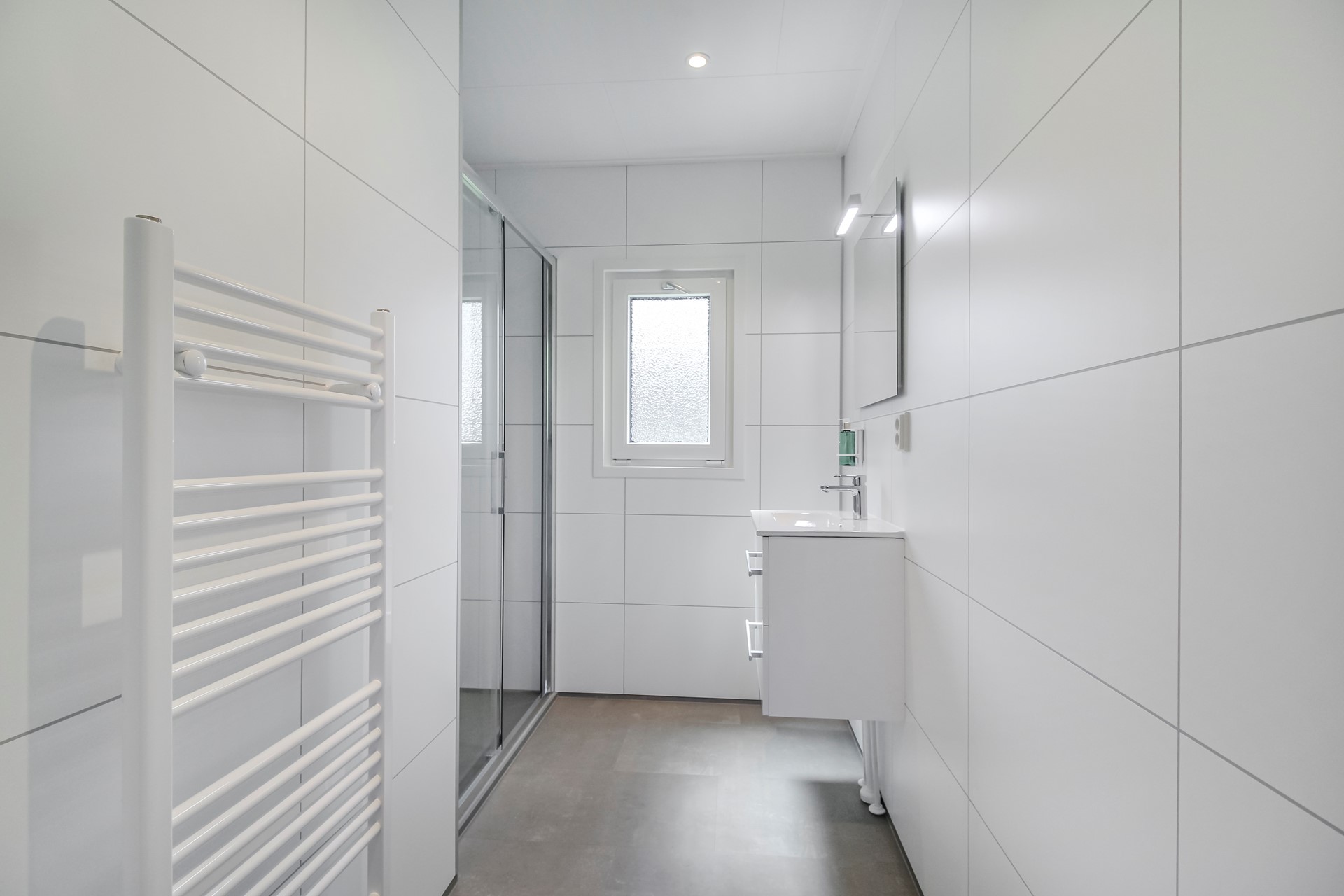 De stijlvolle badkamer is voorzien van een ruime douche, wastafelmeubel en radiator. Daarnaast is er een apart toilet, wat het comfort voor meerdere gasten verhoogt.