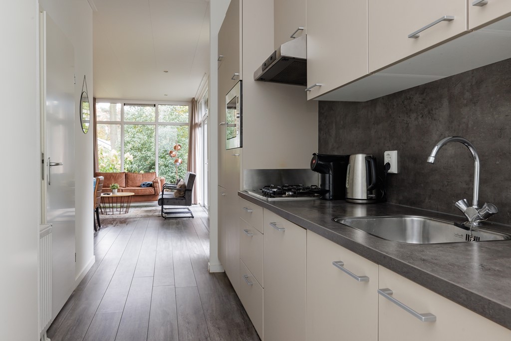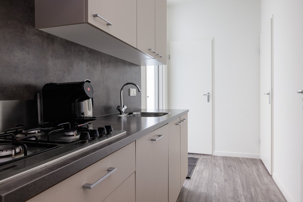 In het hart van de woning vindt u de open keuken, compleet afgewerkt met een achterwand. De open keuken is goed uitgerust met een koffiezetapparaat, waterkoker, gasfornuis, koelkast, vriezer en vaatwasser. Met voldoende werk- en opbergruimte is deze moderne keuken zeer praktisch in gebruik.