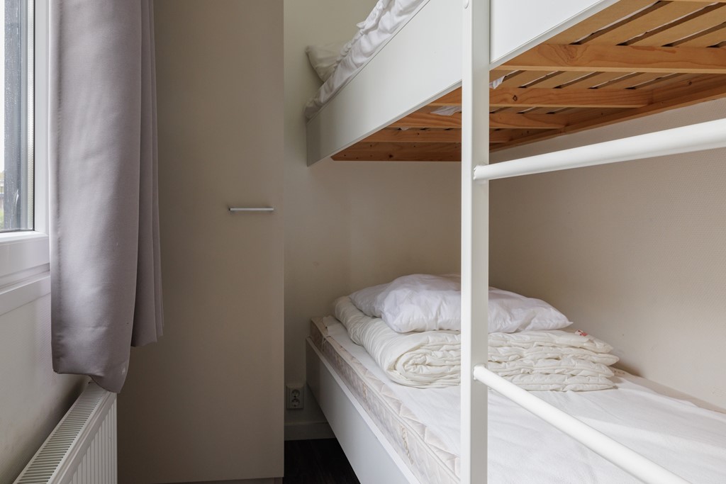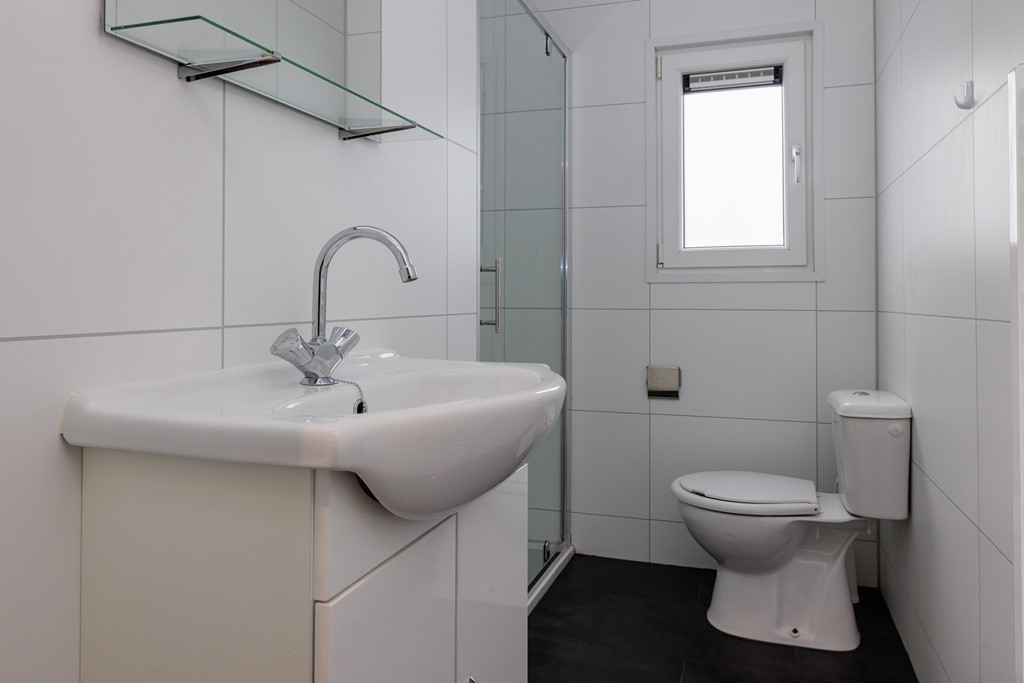 Alle drie de slaapkamers zijn voorzien van comfortabele bedden en bergruimte, met als echte uitblinker de riante schuifwandenkast in de masterbedroom. Tussen de slaapkamers in vindt u de badkamer. De volledig betegelde badkamer is uitgevoerd in een tijdloze kleurencombinatie van zwart met wit en beschikt over een toilet, glazen douchecabine, wastafelmeubel met spiegel en handdoekradiator.