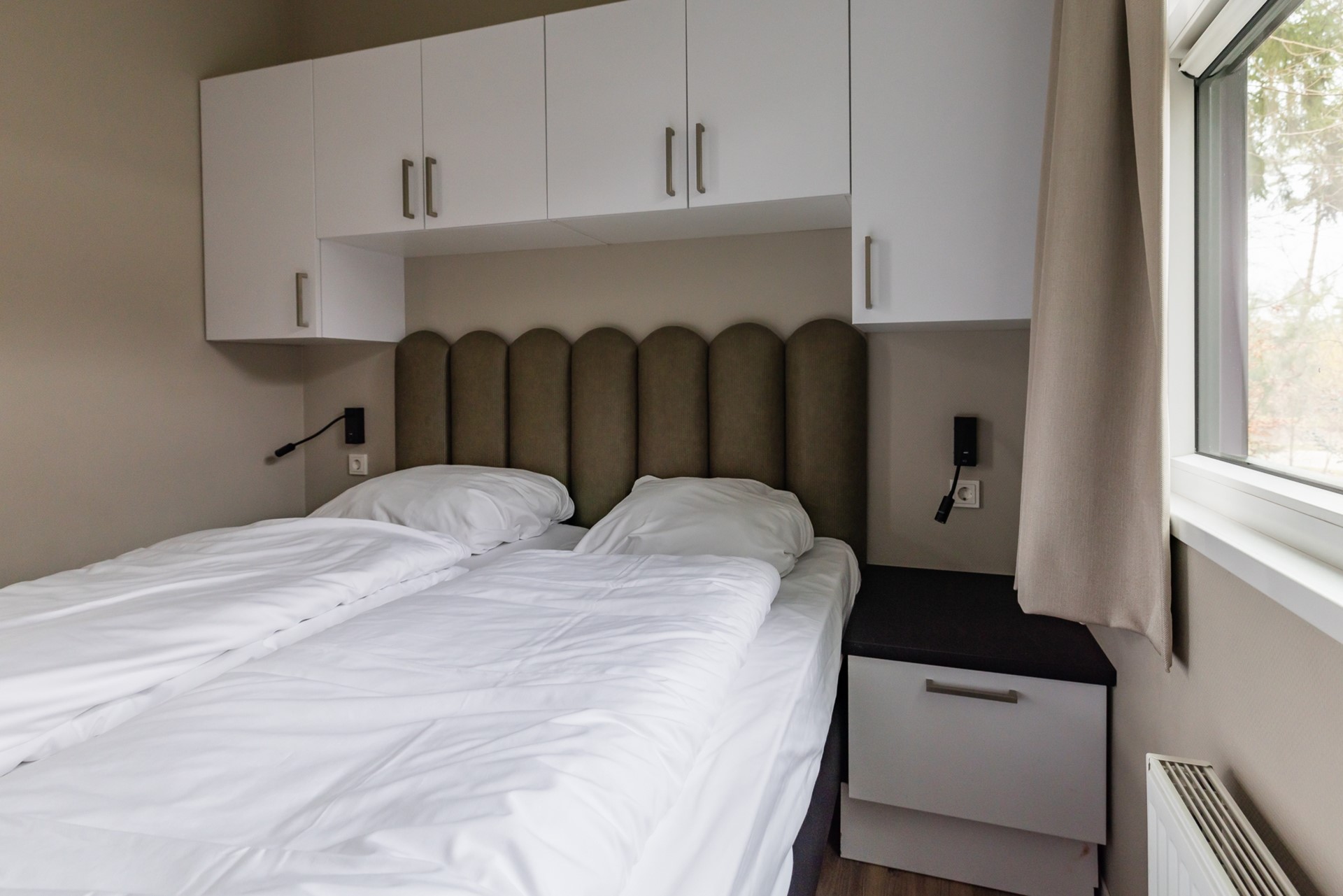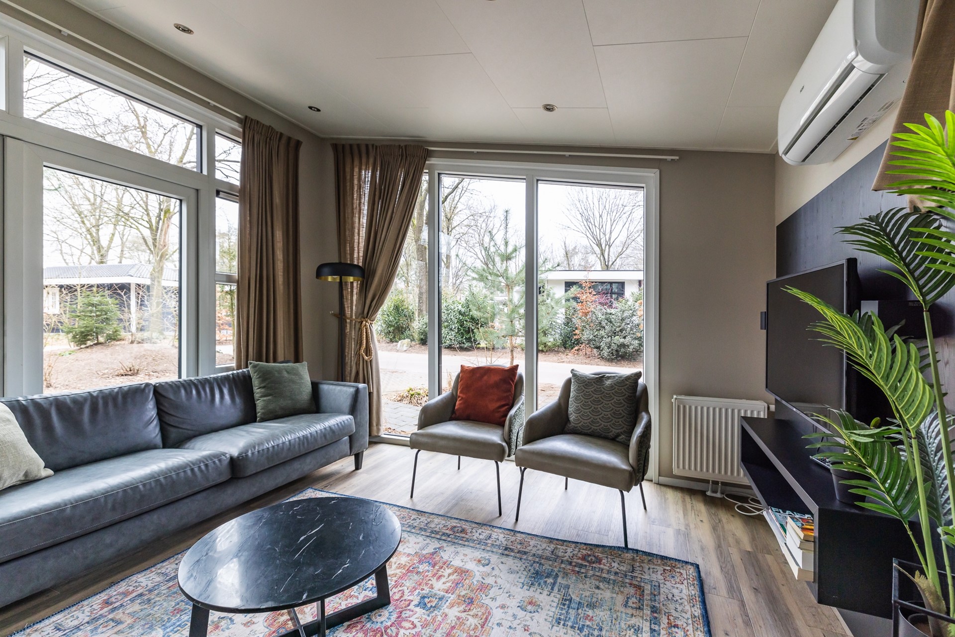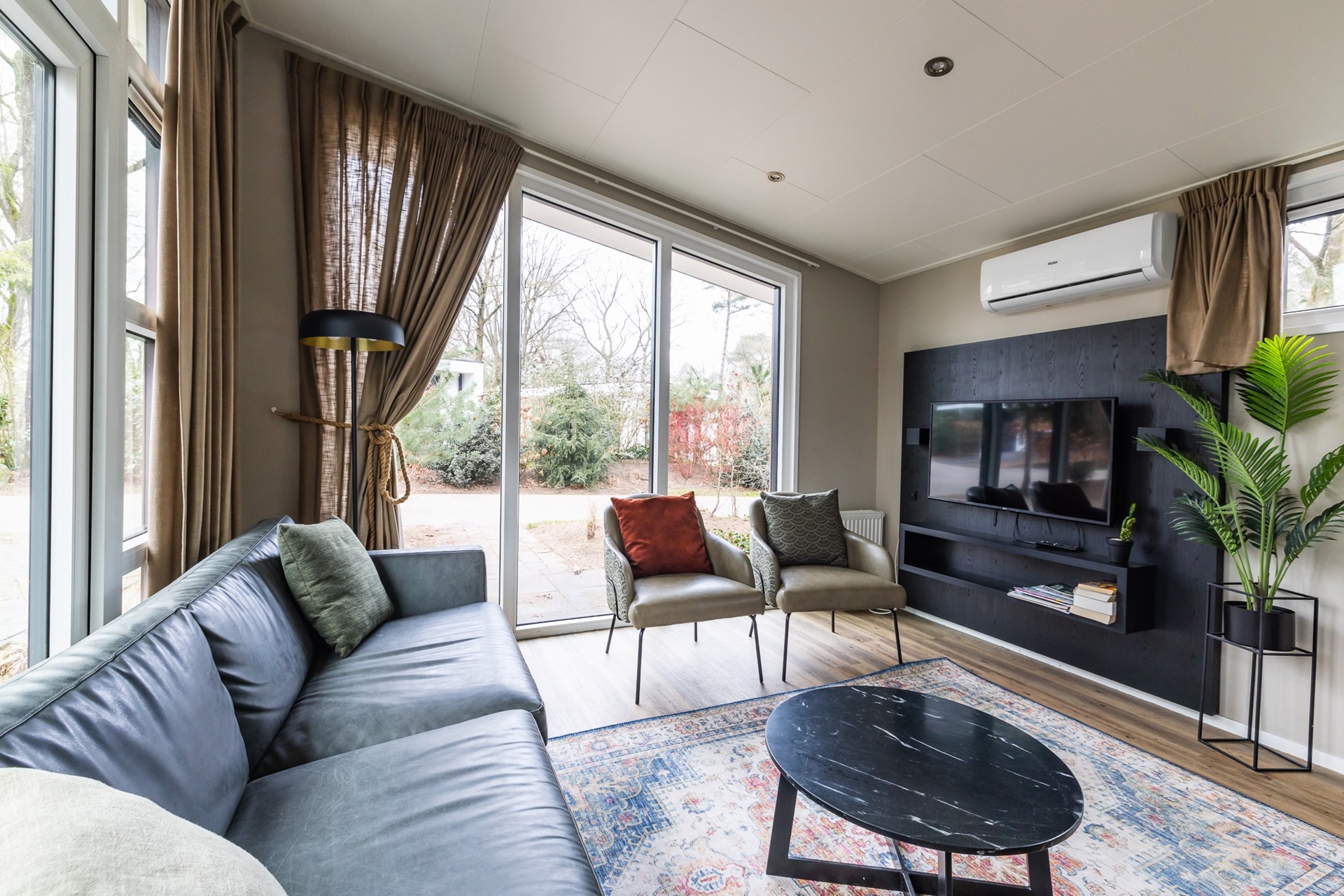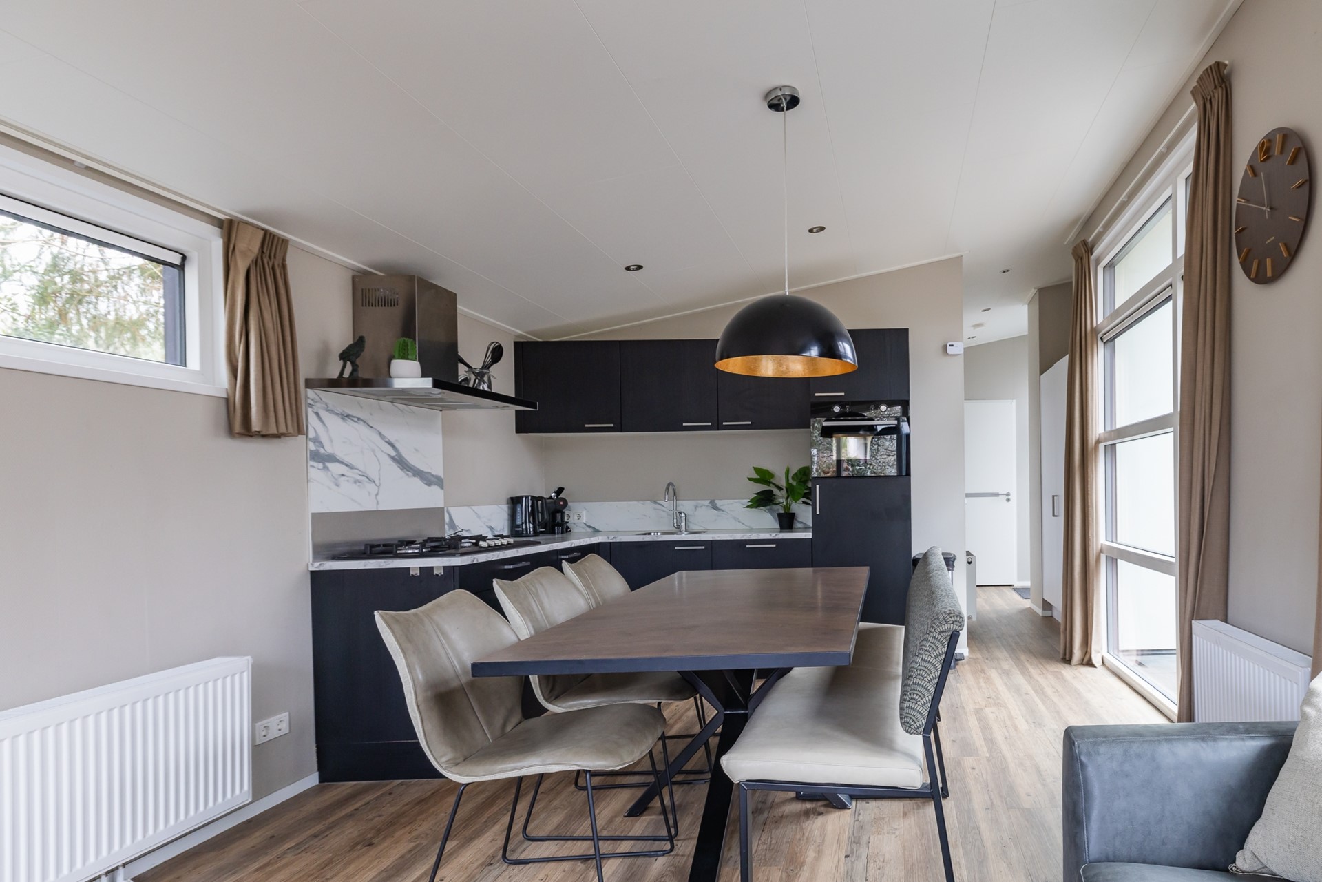 De woning is fraai vormgegeven, met een strak design en warme, natuurlijke uitstraling. Grote raampartijen zorgen voor veel daglicht en een mooi uitzicht op het groen rondom. In de woonkamer vindt u een gezellige zithoek, eettafel en airconditioning die zowel verwarmt als koelt. Ideaal in elk seizoen. De open keuken heeft een luxe uitstraling met zwarte kasten, een marmerlook achterwand en moderne inbouwapparatuur zoals een gaskookplaat, combimagnetron, vaatwasser en koelkast met vriesvak. De keuken is dan ook van alle gemakken voorzien.