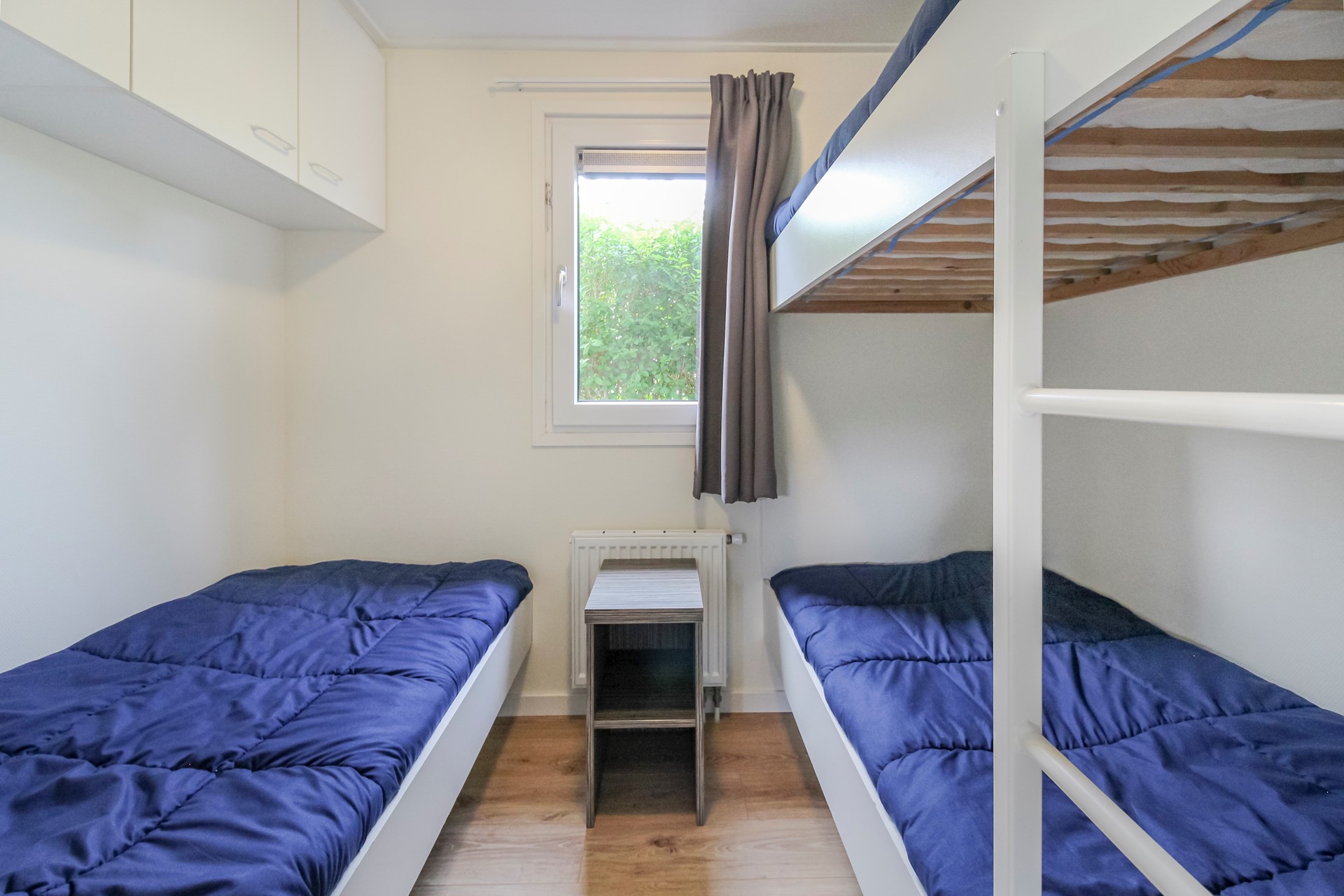De woning is geschikt voor vijf personen en beschikt over twee comfortabele slaapkamers. De ouderslaapkamer is ingericht met een ruim tweepersoonsbed en voldoende kastruimte. In de tweede slaapkamer is een stapelbed én een los bed geplaatst, ideaal voor kinderen of logés.