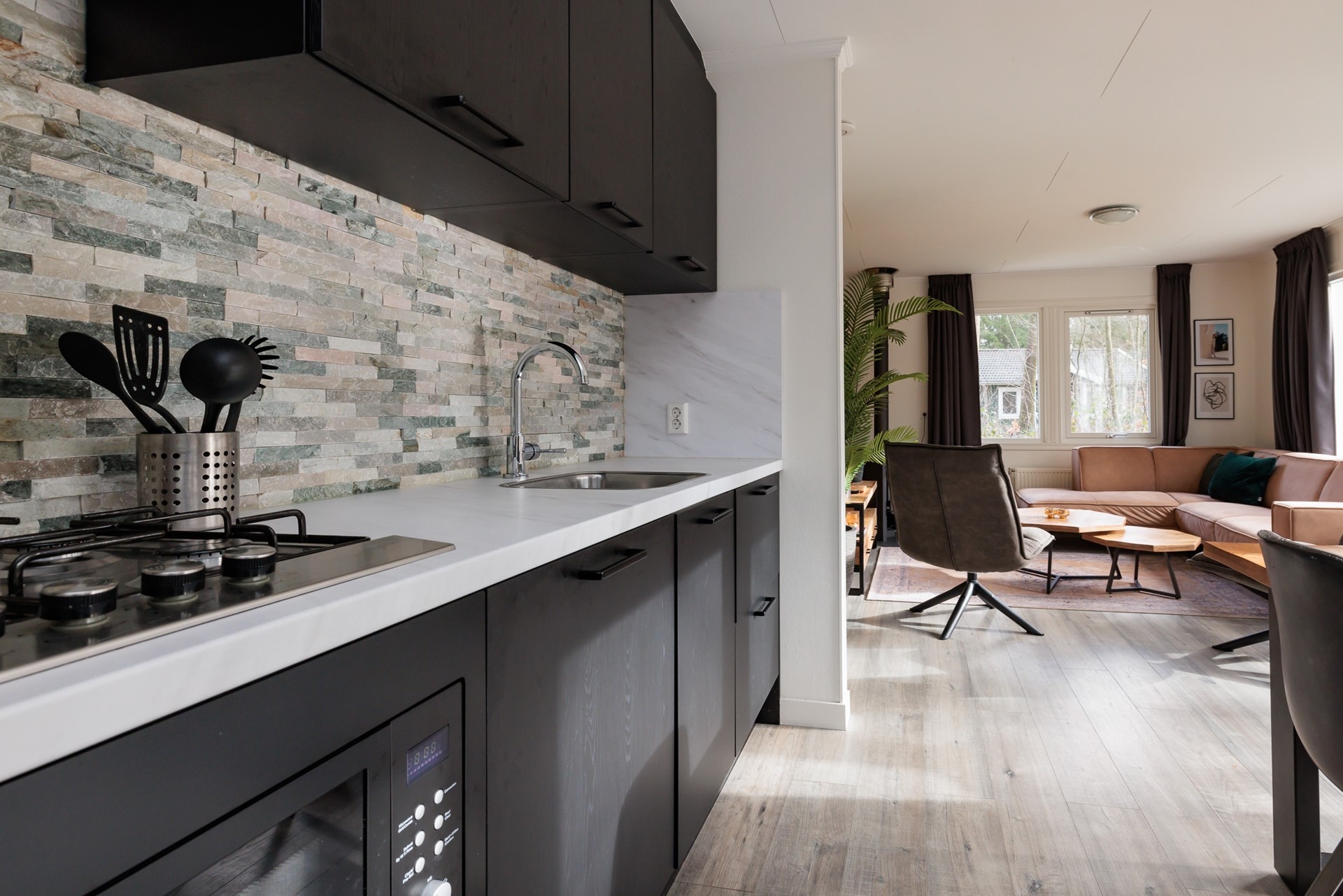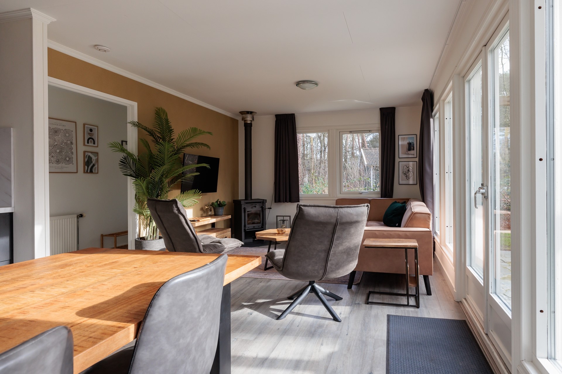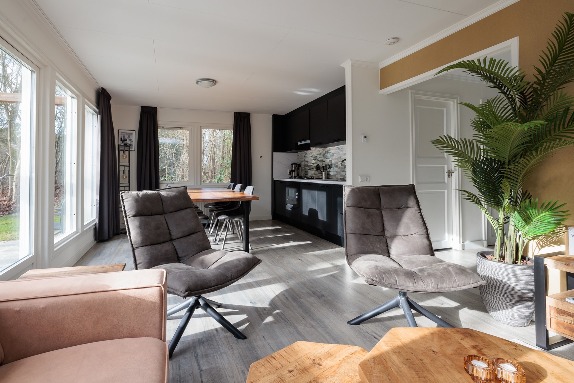 De leefruimte is open en uitnodigend, met een warme, moderne uitstraling waarin natuurlijke materialen en rustige tinten samenkomen. De zithoek vormt een fijne plek om te ontspannen, terwijl de royale eettafel uitnodigt tot lange avonden tafelen met familie of vrienden. De strak afgewerkte keuken sluit hier naadloos op aan en is volledig uitgerust om comfortabel te koken en te genieten.