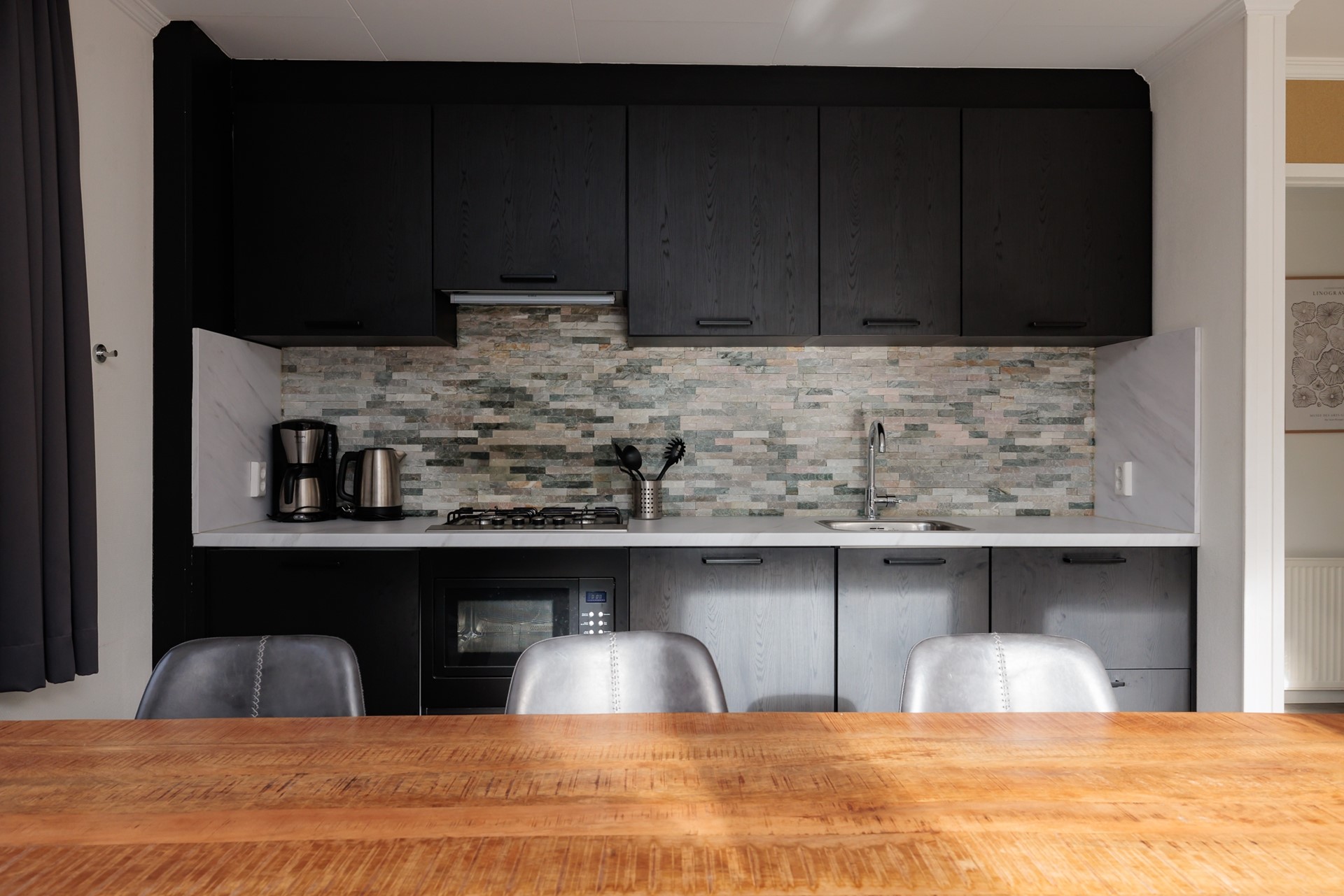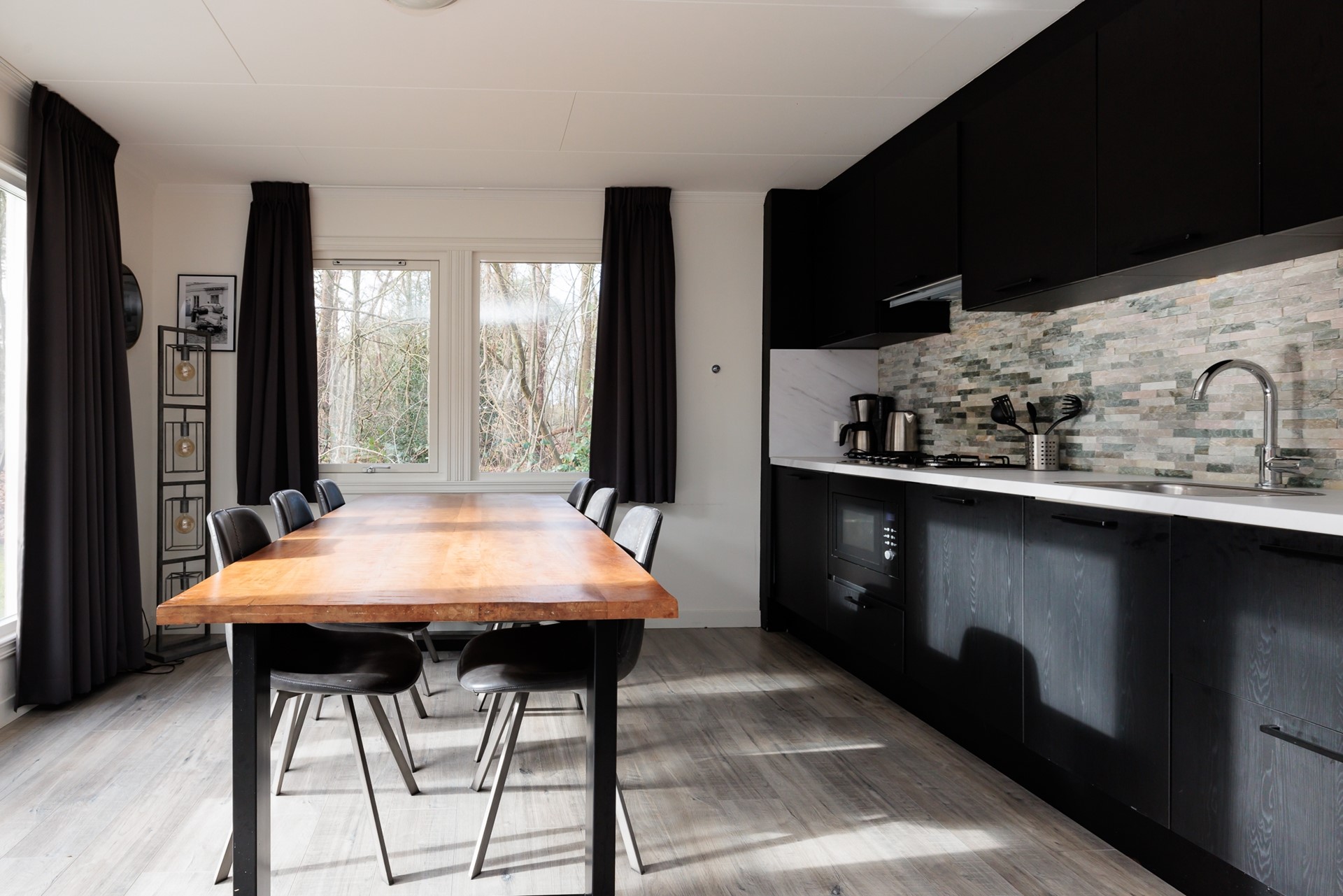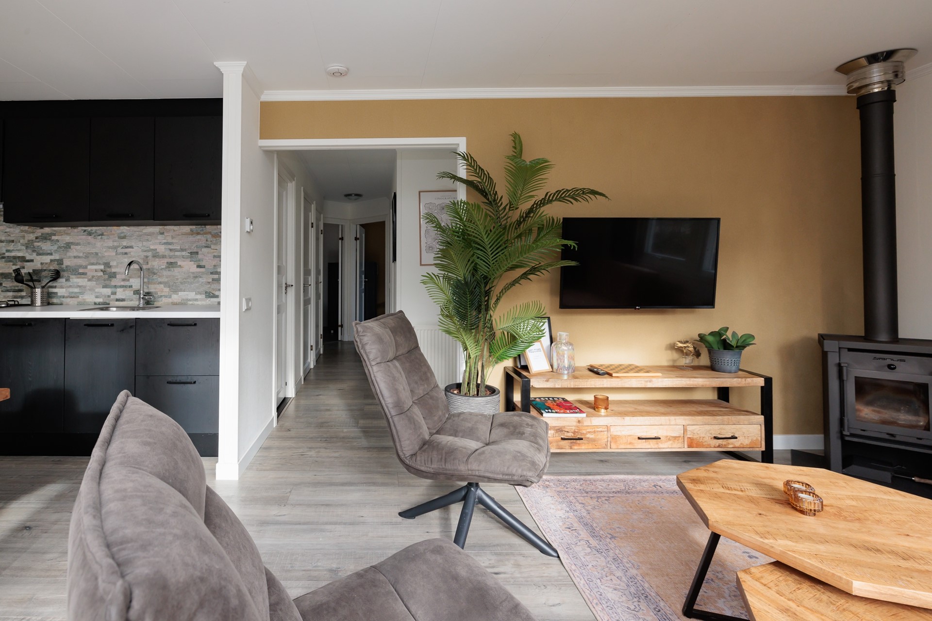 De leefruimte is open en uitnodigend, met een warme, moderne uitstraling waarin natuurlijke materialen en rustige tinten samenkomen. De zithoek vormt een fijne plek om te ontspannen, terwijl de royale eettafel uitnodigt tot lange avonden tafelen met familie of vrienden. De strak afgewerkte keuken sluit hier naadloos op aan en is volledig uitgerust om comfortabel te koken en te genieten.