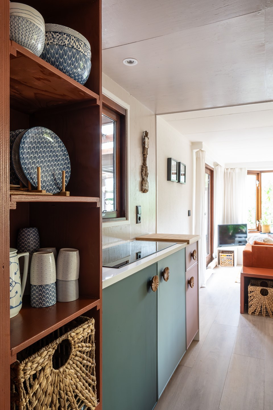 Overal ziet u liefde voor detail, van de fel oranje voordeur tot de rotan stoelen onder het dak van boomstammen en klimop.