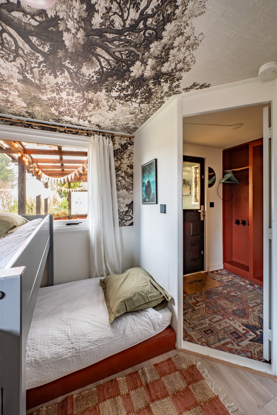 - Tweede slaapkamer met speels stapelbed en uniek behang – bijna een sprookjeskamer