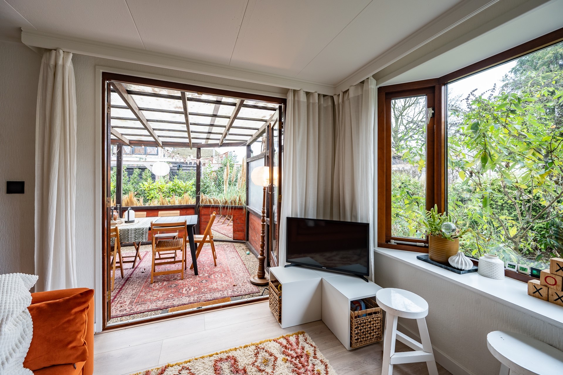 - Lichte woonkamer met grote ramen, warme tinten en doorkijk naar het groen