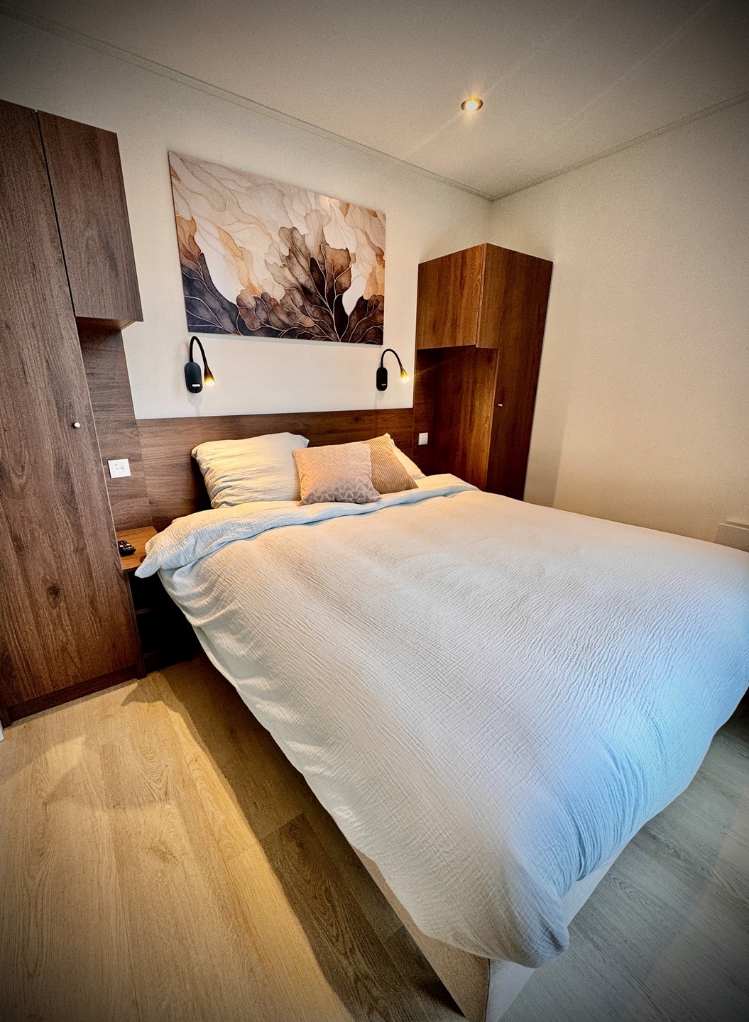 De recreatiewoning beschikt over een ruime living voorzien van een luxe inrichting met TV, eetkamer en keuken. De luxe keuken is uitgerust met een inductie kookplaat met ingebouwde afzuiging, combi-oven en vaatwasser. Twee slaapkamers zijn voorzien van 2 x een éénpersoons boxspringbed, een TV en ruime opbergmogelijkheden. Daarnaast beschikt de recreatiewoning over een derde slaapkamer met stapelbed. De luxe badkamer is van alle gemakken voorzien. Indien gewenst worden de recreatiewoningen geheel gemeubileerd opgeleverd. Tijdens het aankooptraject is het mogelijk om de woning in samenwerking met de bouwer volledig naar wens te configureren.